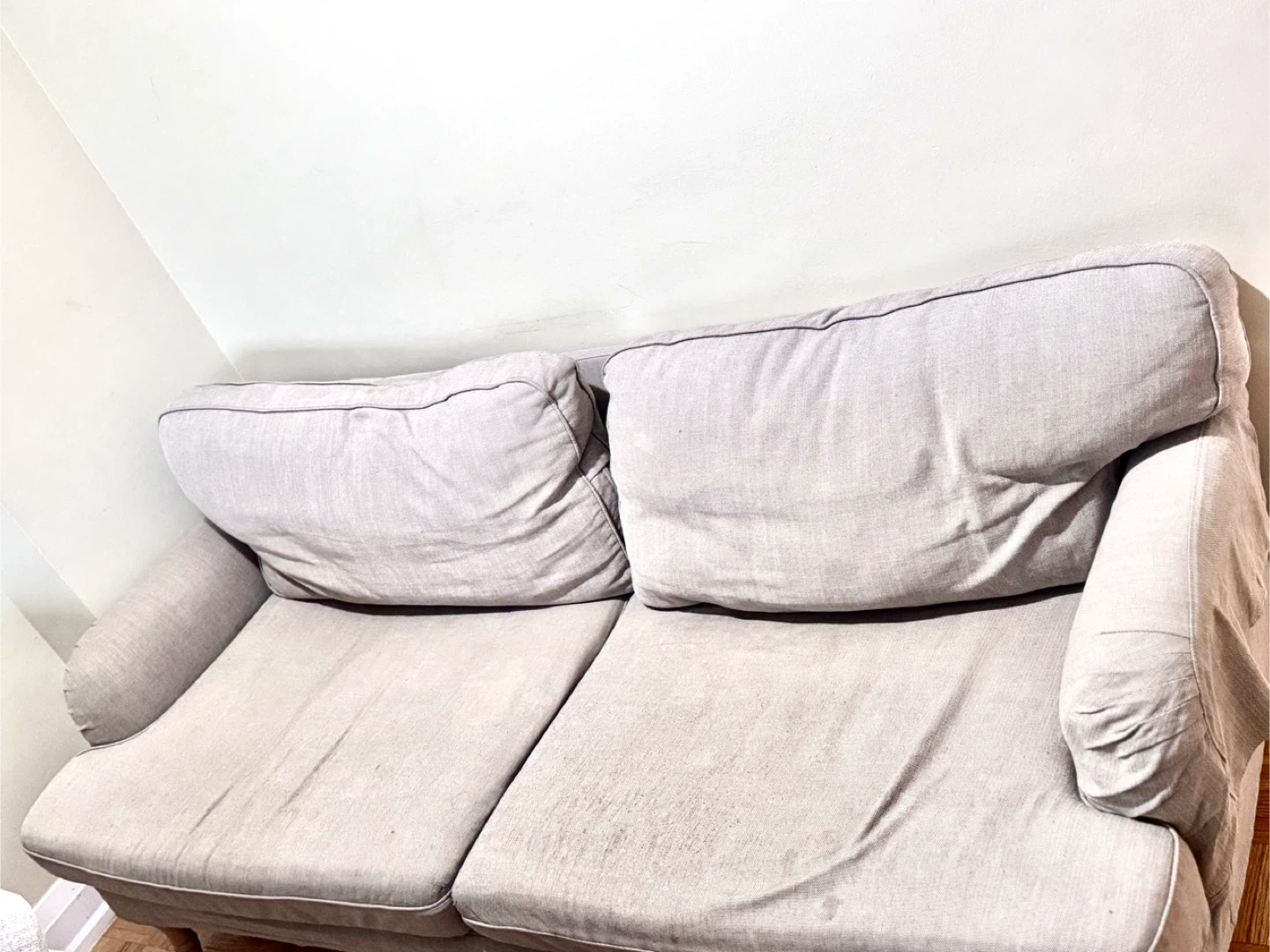 Selling a used loveseat sofa. It's a cozy grey colour and would be perfect for a small space. It has some signs of wear, but it's still comfortable and functional