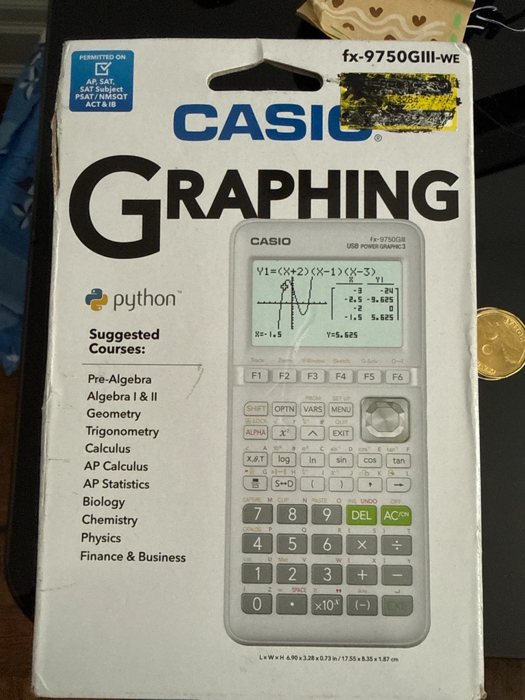 Selling a brand new, in-box Casio fx-9750GIII graphing calculator! It's never been used and is perfect for students taking courses like Pre-Algebra, Algebra I & II, Geometry, Trigonometry, Calculus, AP Calculus, AP Statistics, Biology, Chemistry, Physics, and Finance & Business. It supports Python and has a USB power graphic 3. The box includes the calculator itself and all original packaging materials
