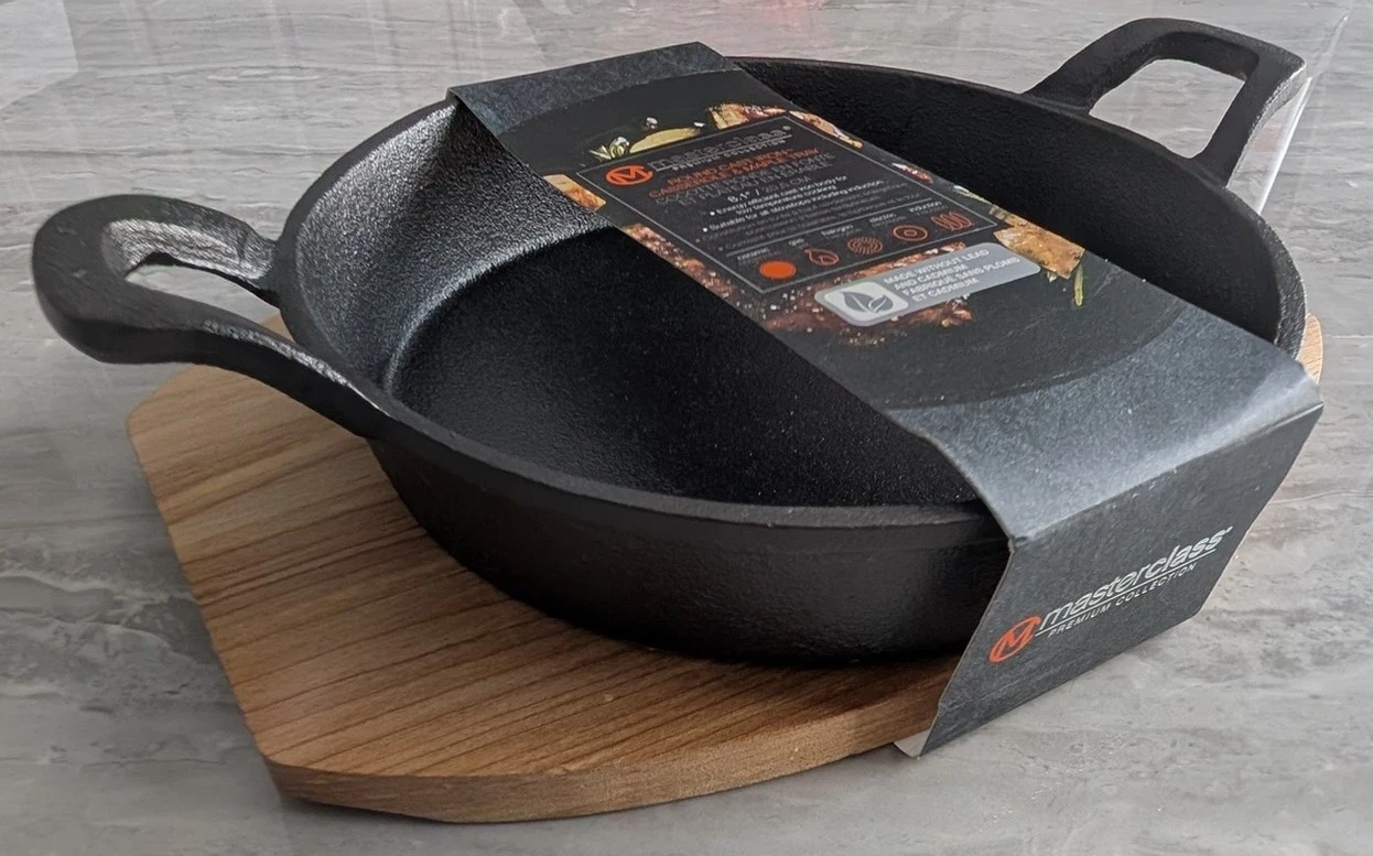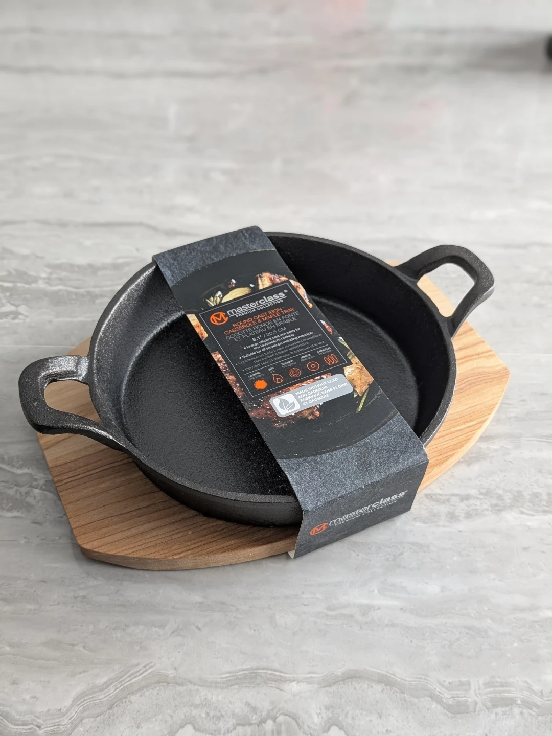 Selling a brand new Masterclass Premium Collection Round Cast Iron Casserole & Maple Tray! It's 8.1" / 20.5 cm and suitable for all stovetops including induction. Made without lead and cadmium, it's an energy efficient cast iron body for low temperature cooking.