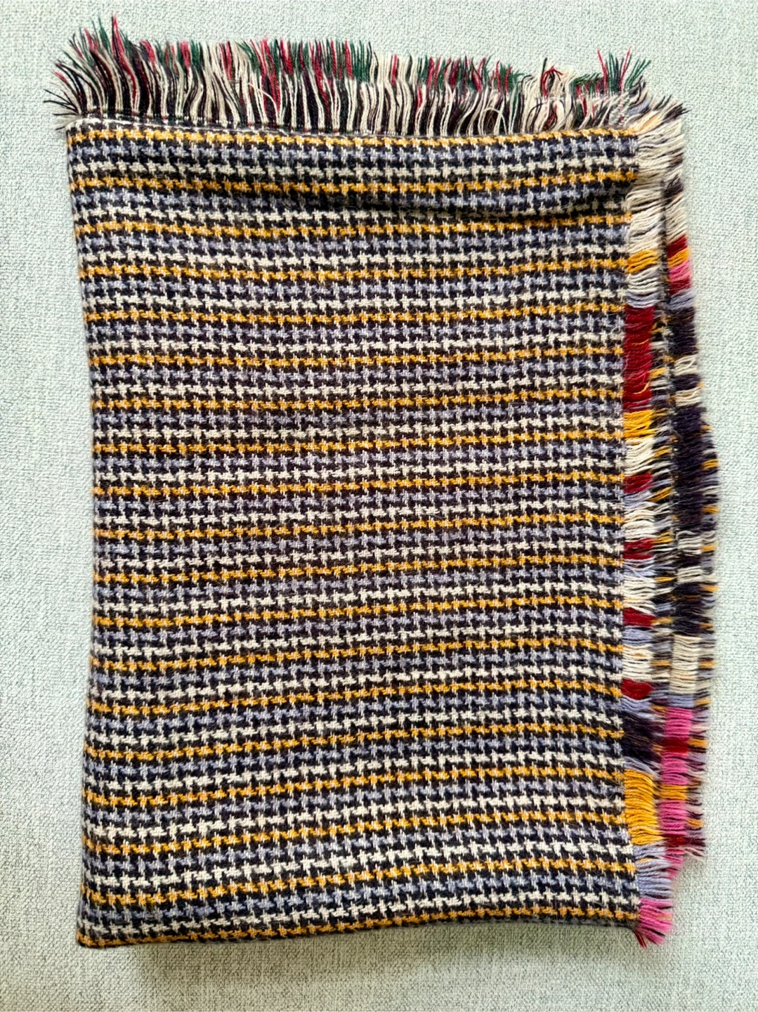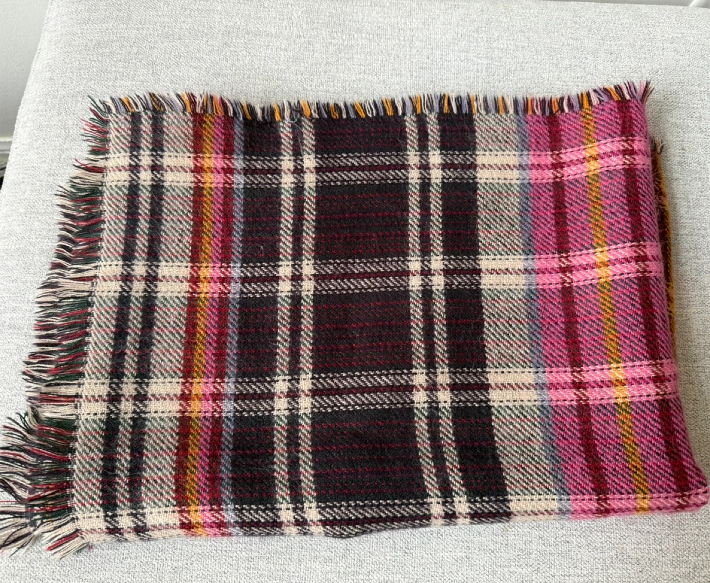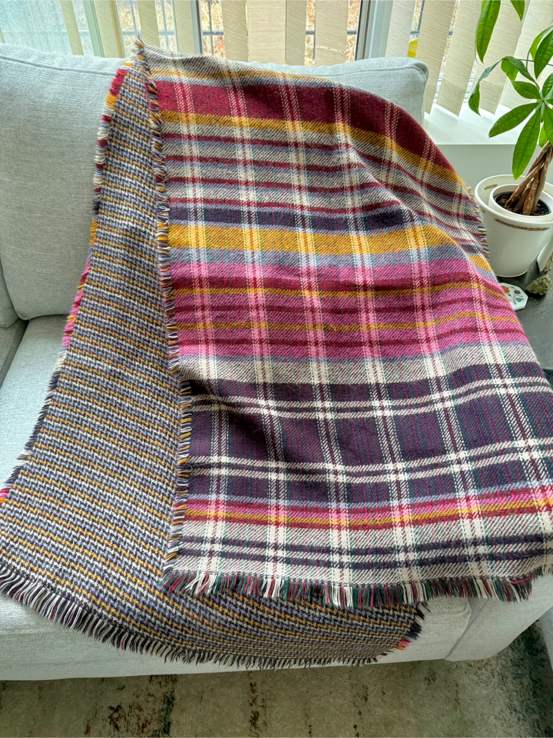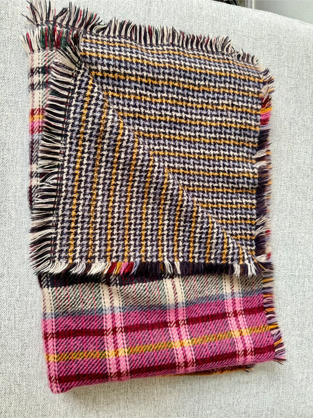 Classic plaid pattern with shades of pink, burgundy, and grey on one side