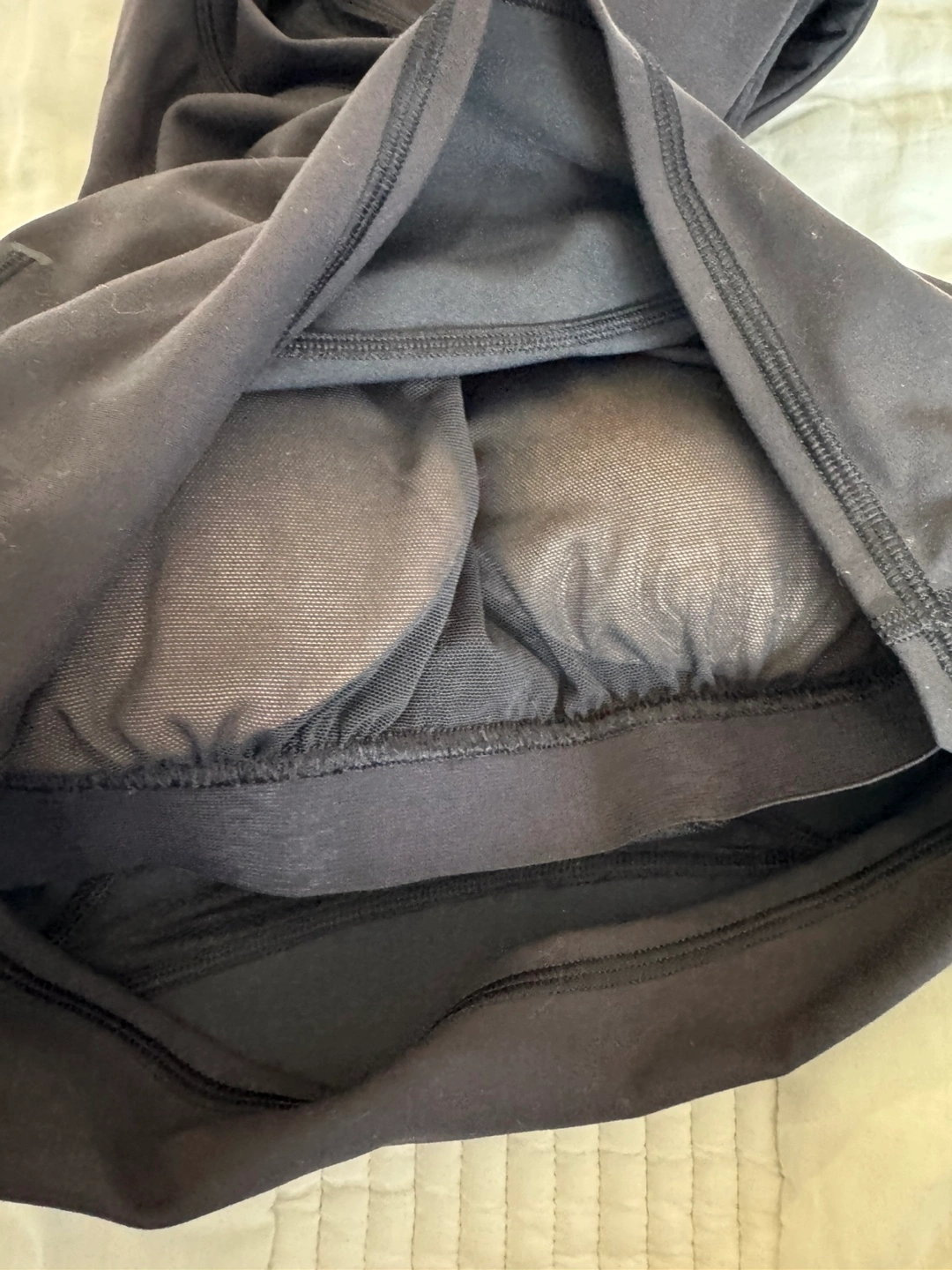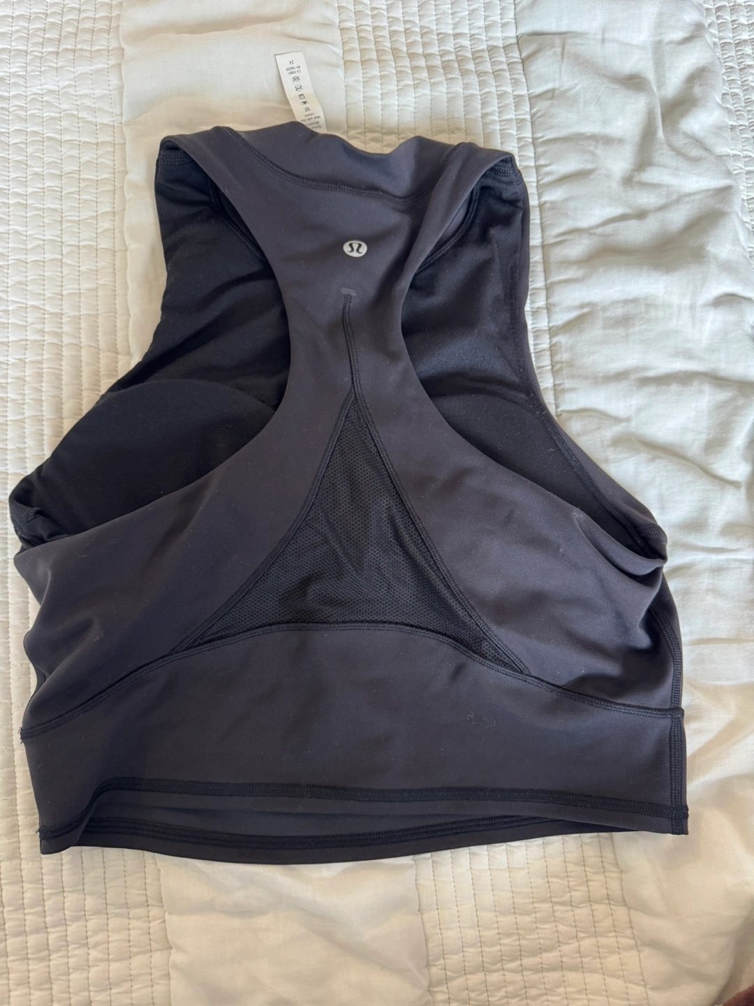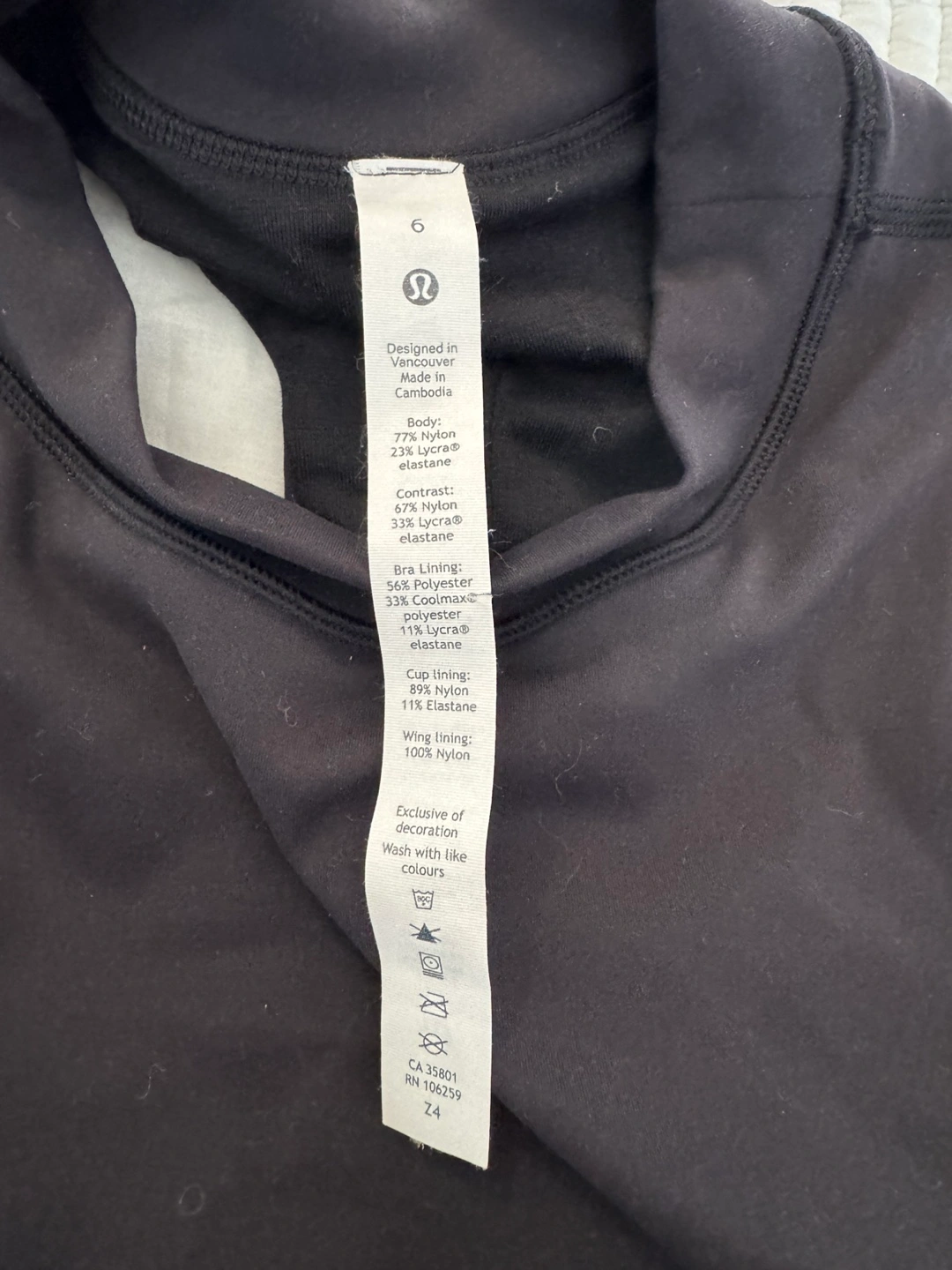 Selling a Lululemon workout top in black, size 6. The body is made of 77% nylon and 23% lycra elastane. The bra lining is 56% coolmax polyester and 44% lycra elastane. Cup lining is 81% nylon and 19% elastane. Wing lining is 100% nylon