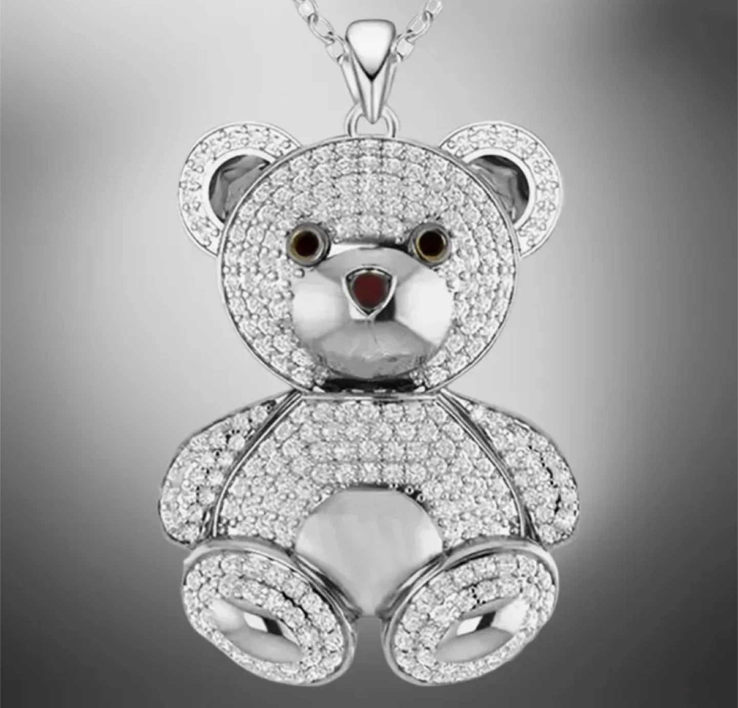 This adorable teddy bear pendant necklace is sure to bring a smile to your face! The pendant is covered in sparkling stones and comes with its original box