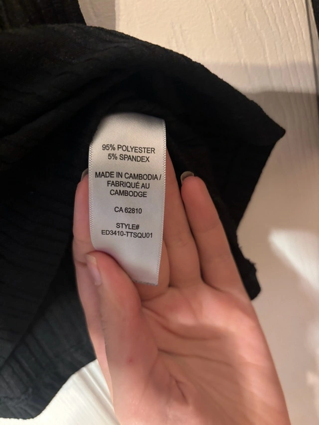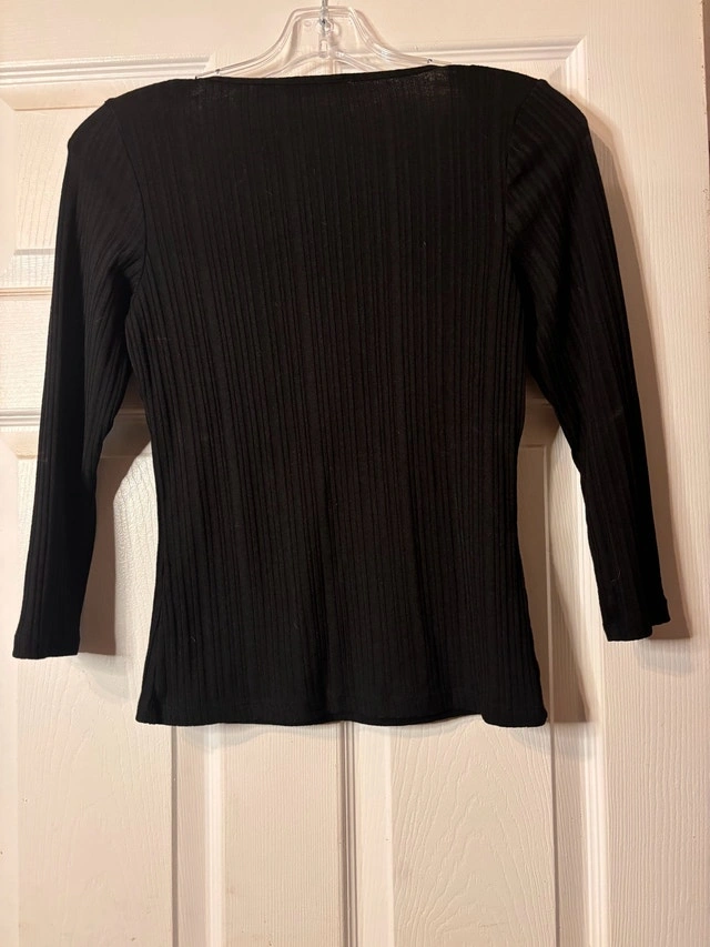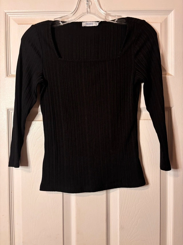 Classic black ribbed long-sleeve top from Ricki’s with a flattering square neckline. Soft, stretchy fabric that hugs nicely without feeling tight. Perfect for layering or wearing on its own — easy to dress up or down.