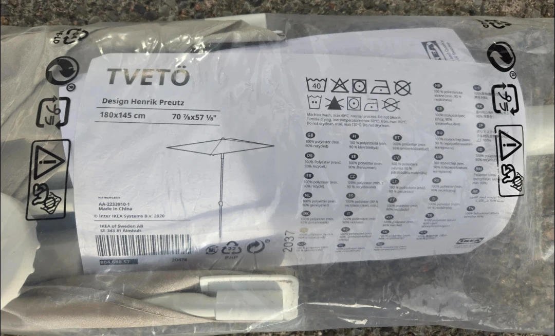 Selling a brand new IKEA TVETÖ parasol, designed by Henrik Preutz. It's sized at 180x145 cm (70 7/8 x 57 1/8 inches). The material is 100% polyester! Origina sealed packaging !