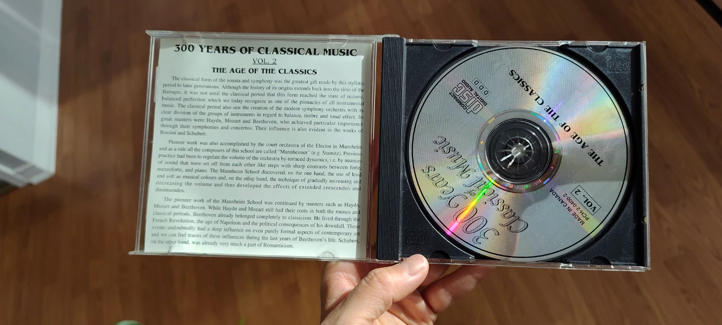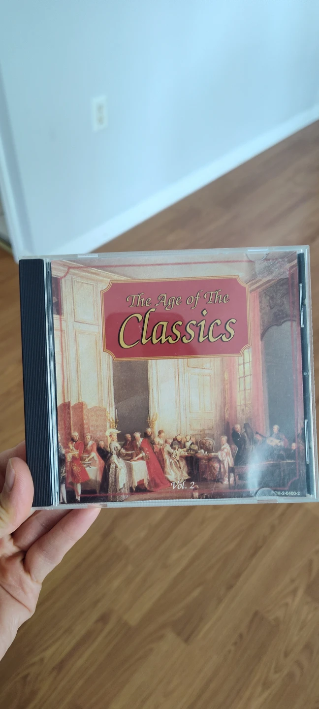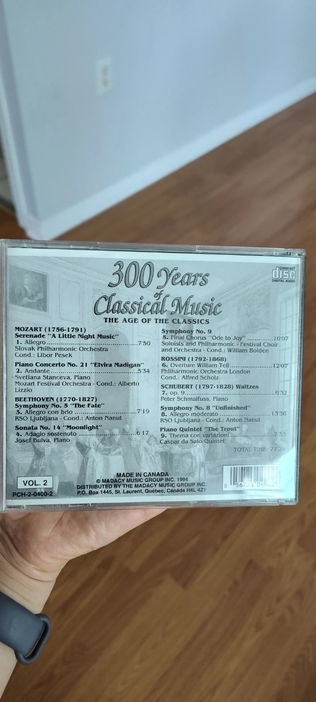 Selling a CD titled "300 Years Classical Music: The Age of The Classics, Vol. 2". It features compositions from Mozart, Beethoven, and Rossini, among others. The total time is 77:29. Made in Canada by Madacy Music Inc in 1994.