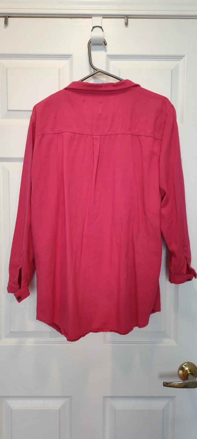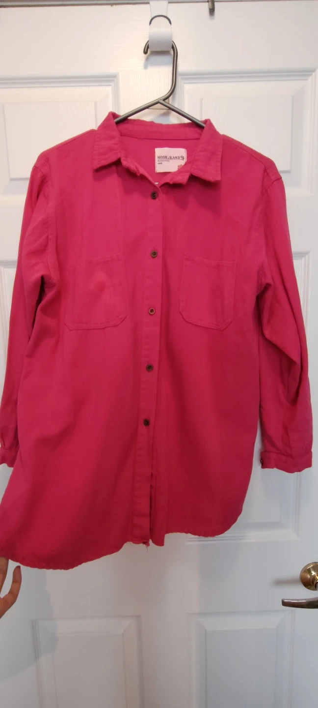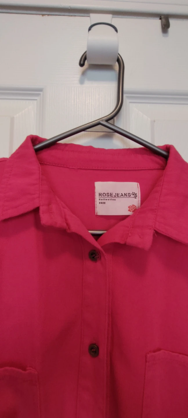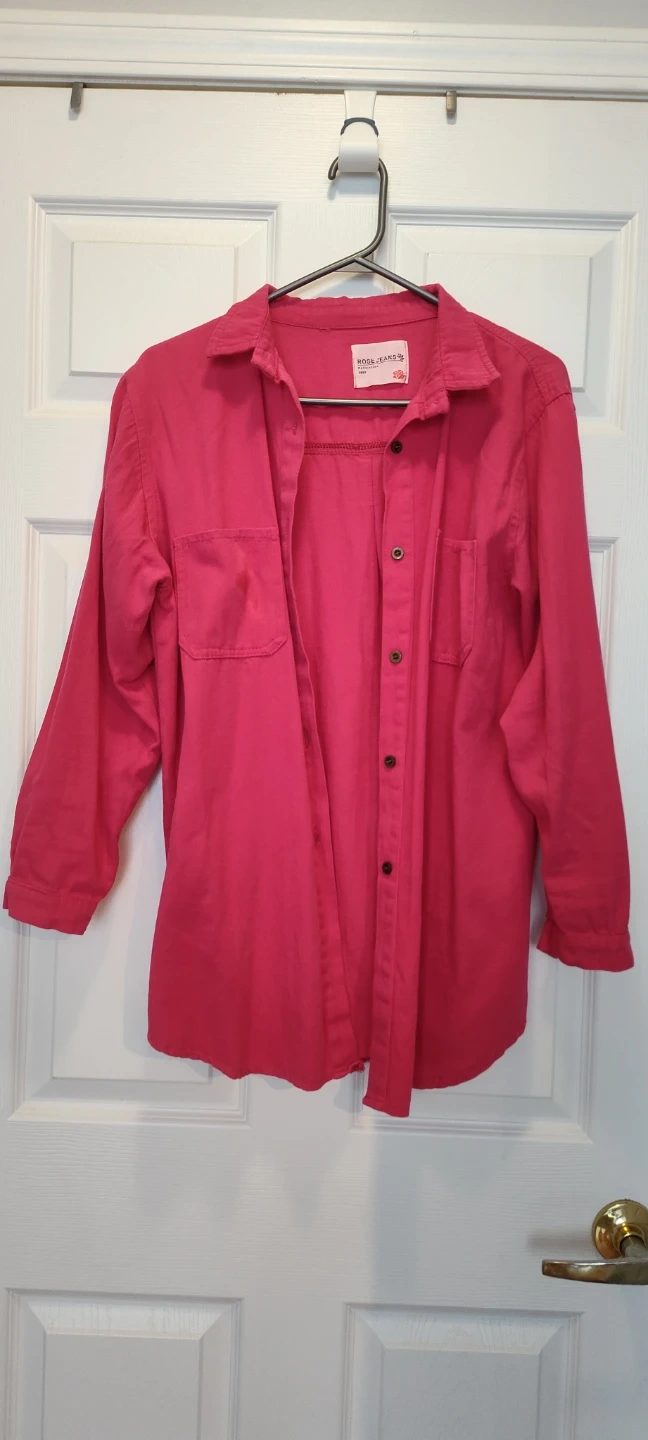 A cute Rose Jeans button-down shirt in a lovely pink colour! It has a classic design with two front pockets. Perfect for a casual day out or layering with other pieces. It's in great condition and ready for a new home!