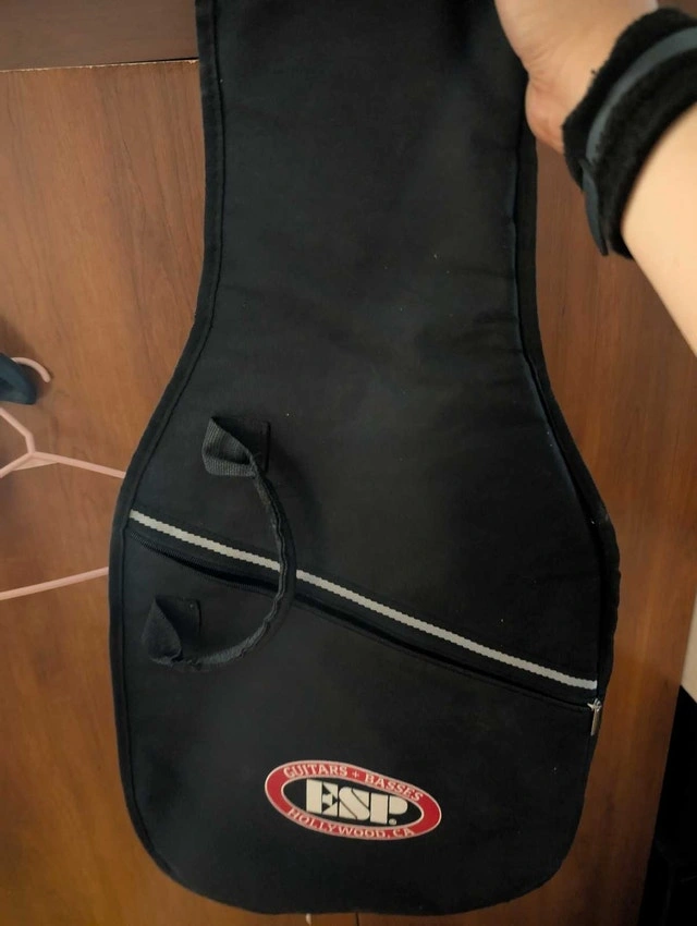 This ESP guitar bag is designed to carry your electric guitar safely and comfortably. While it has been previously carried with love, it remains in good condition, ready to protect your instrument from bumps and scratches. It's a reliable choice for any guitarist on the go!