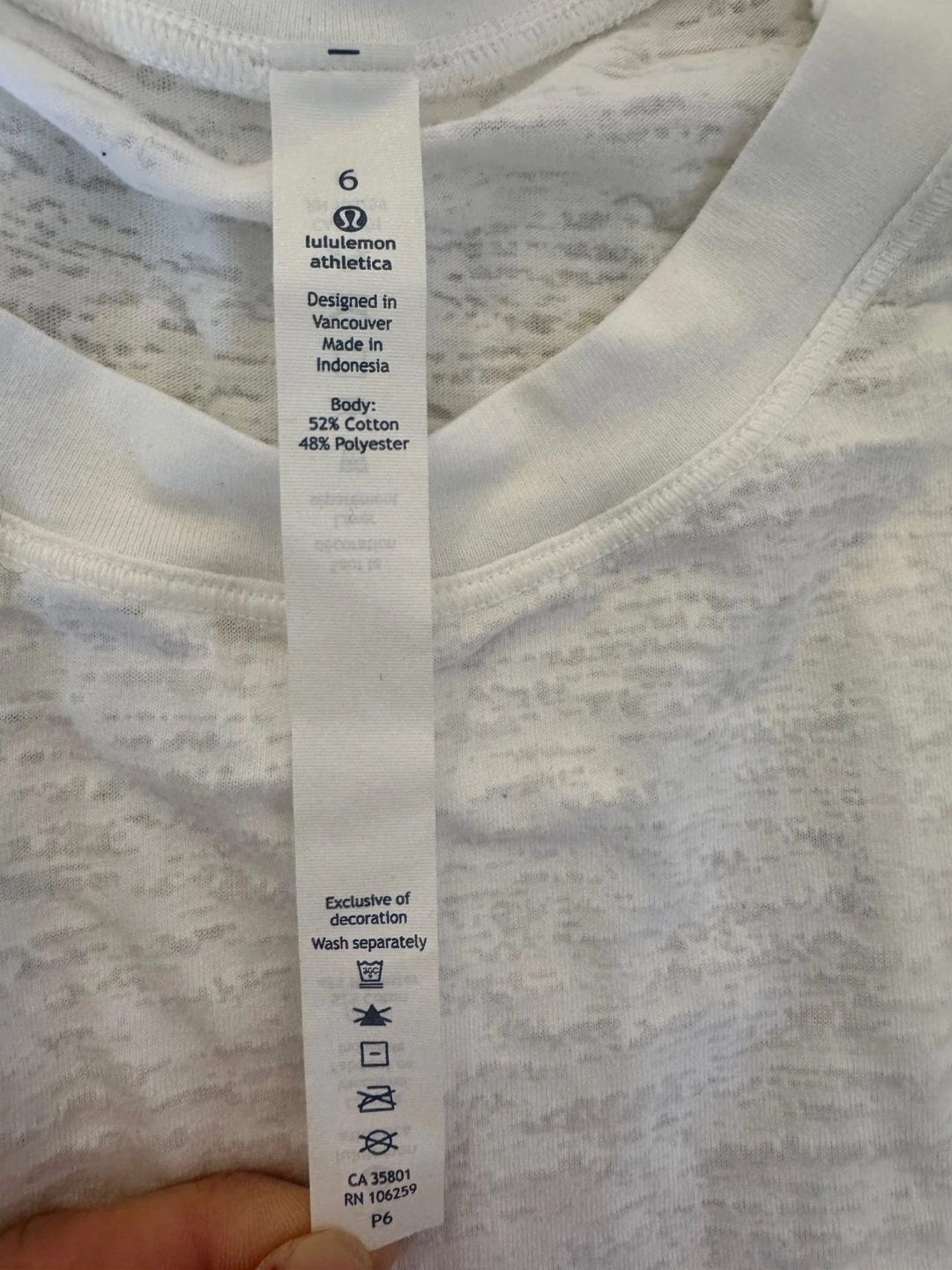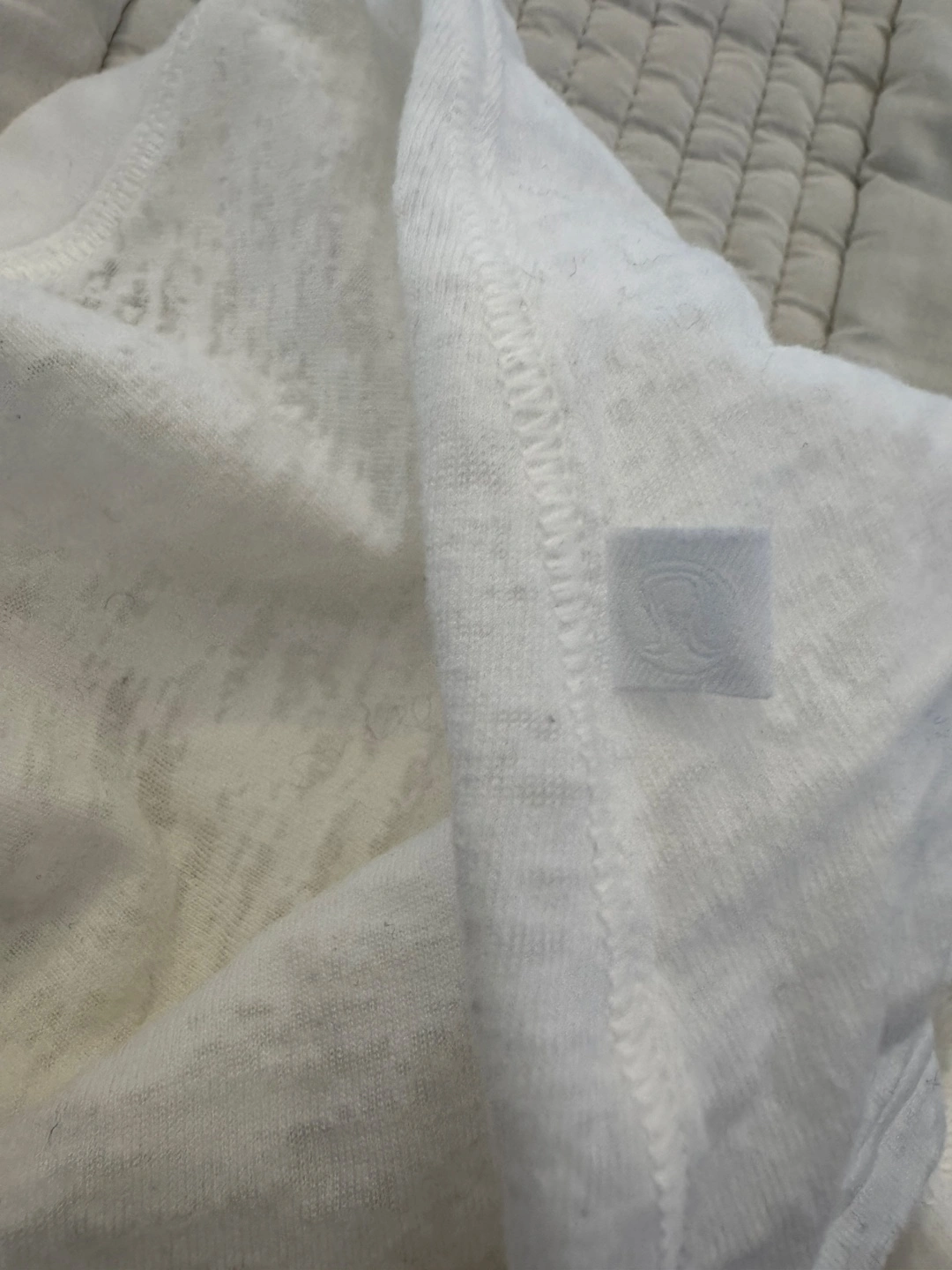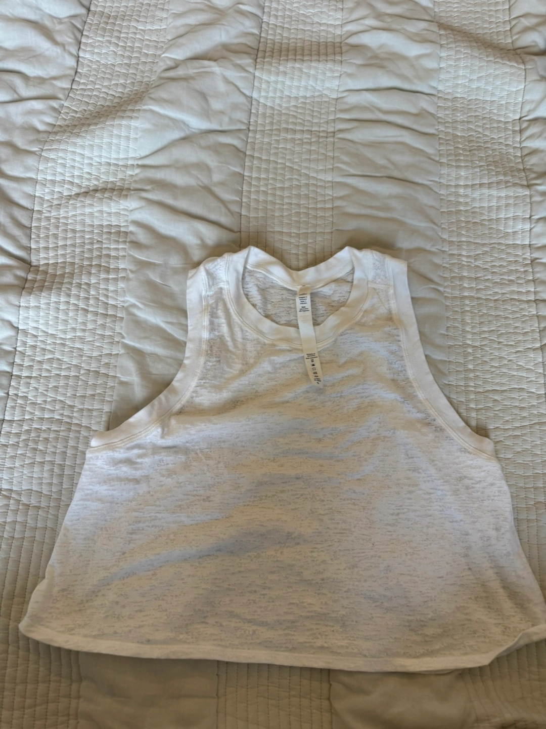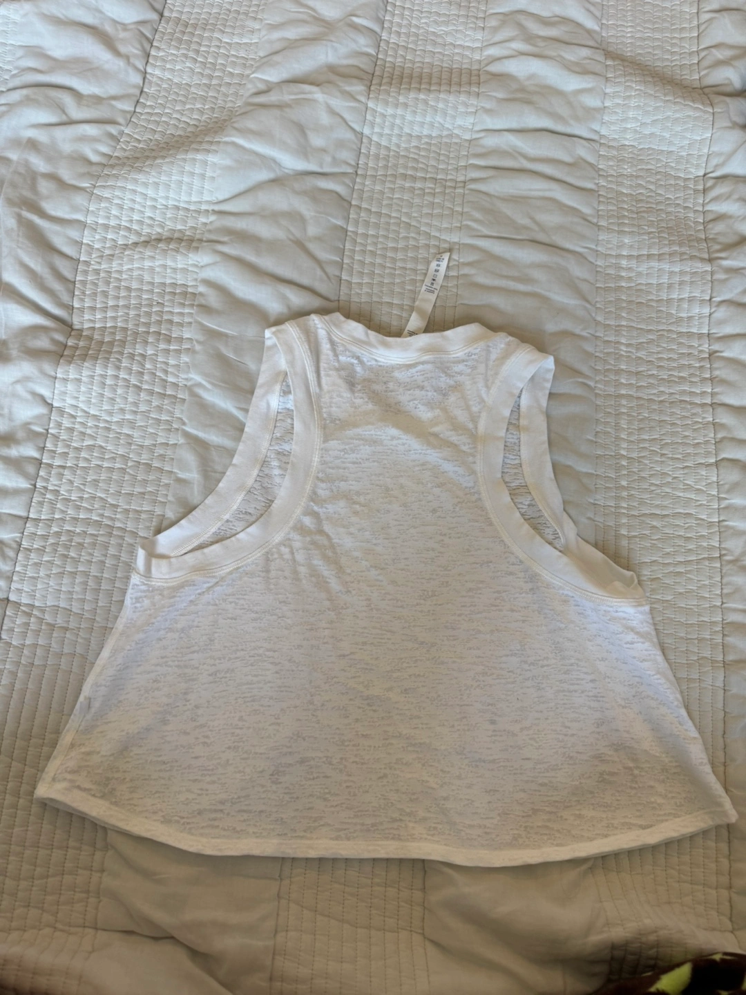Selling a Lululemon Athletica tank top in white. The size is 6. The body is made of 52% cotton and 48% polyester.