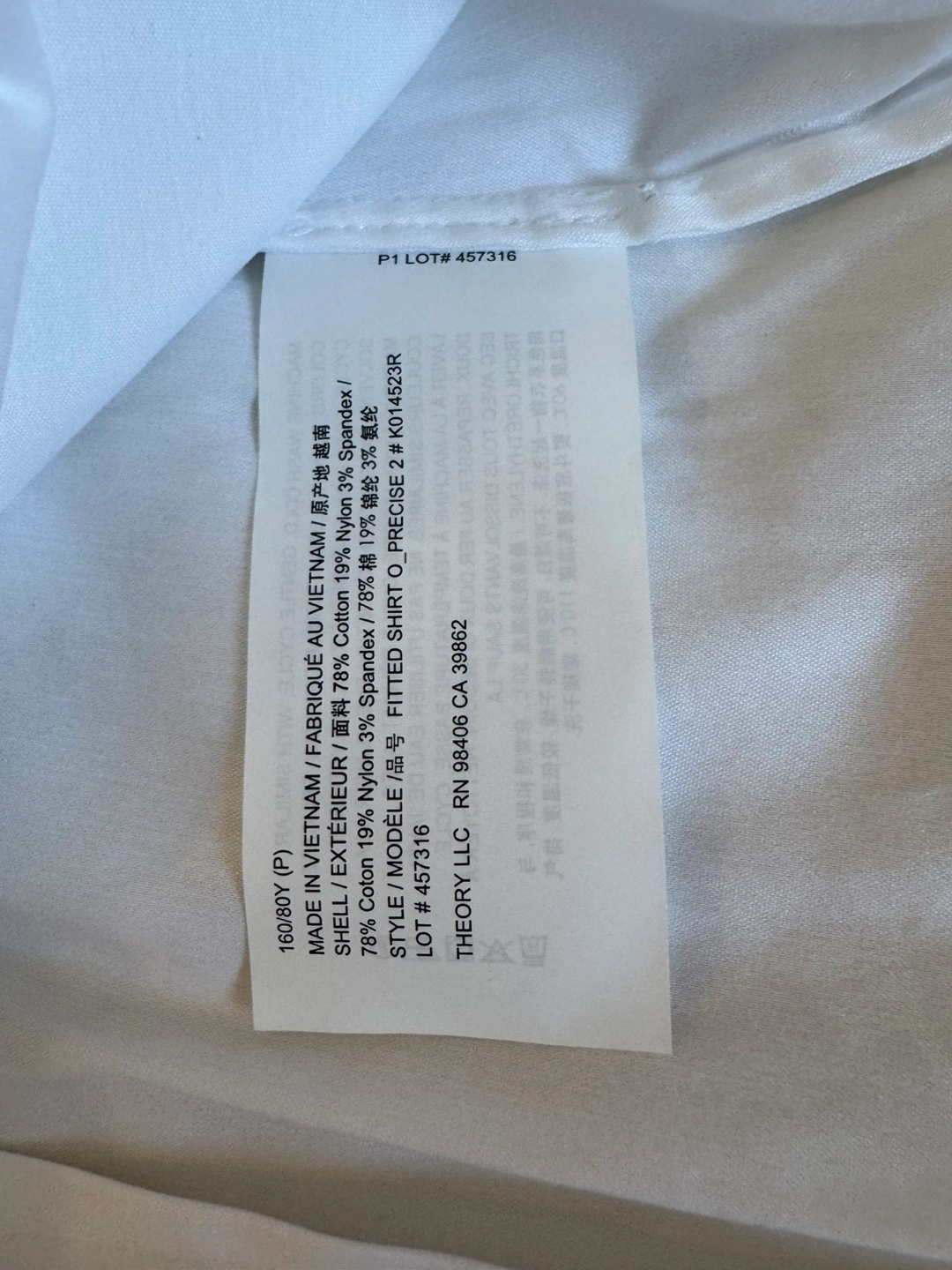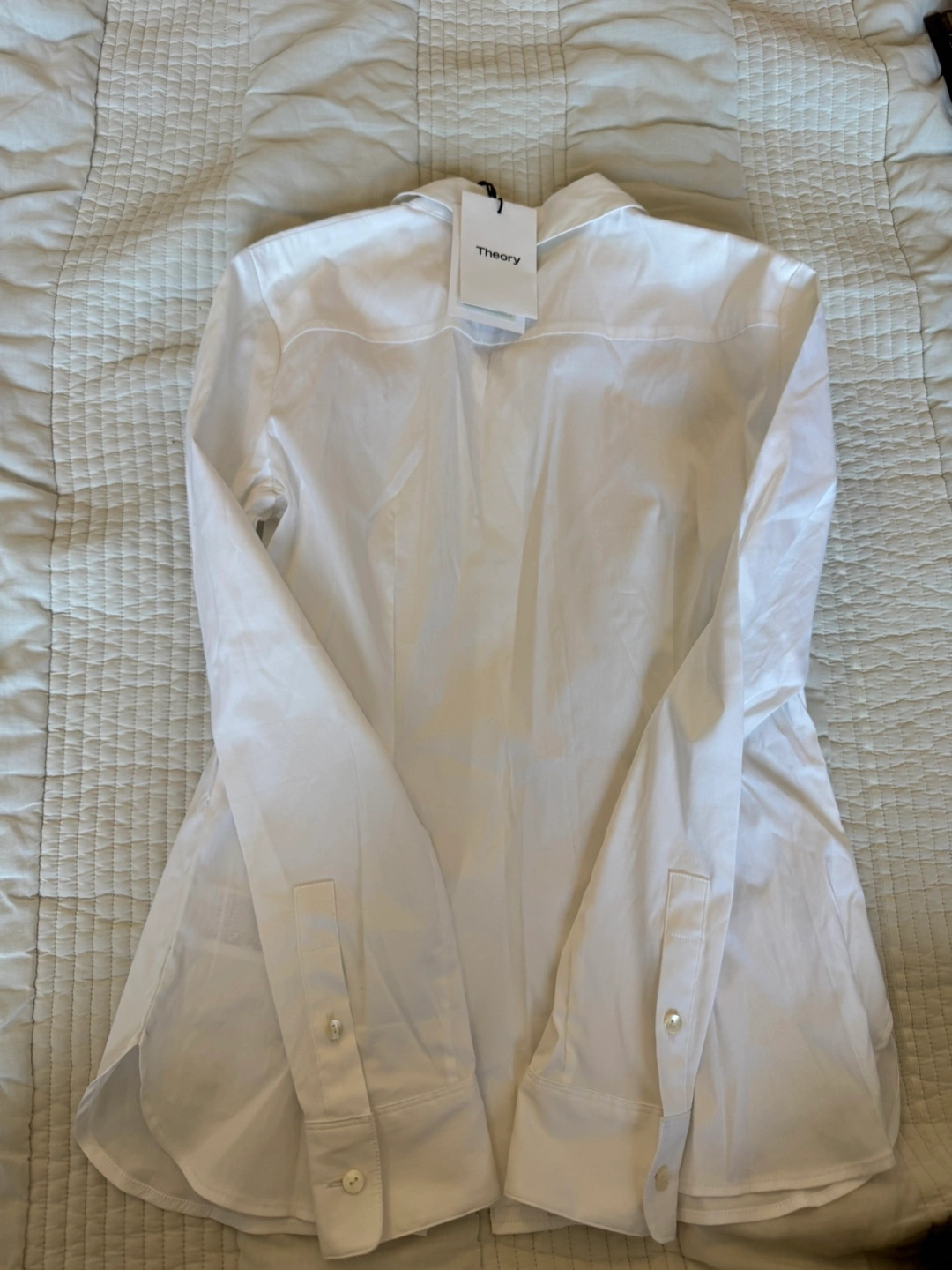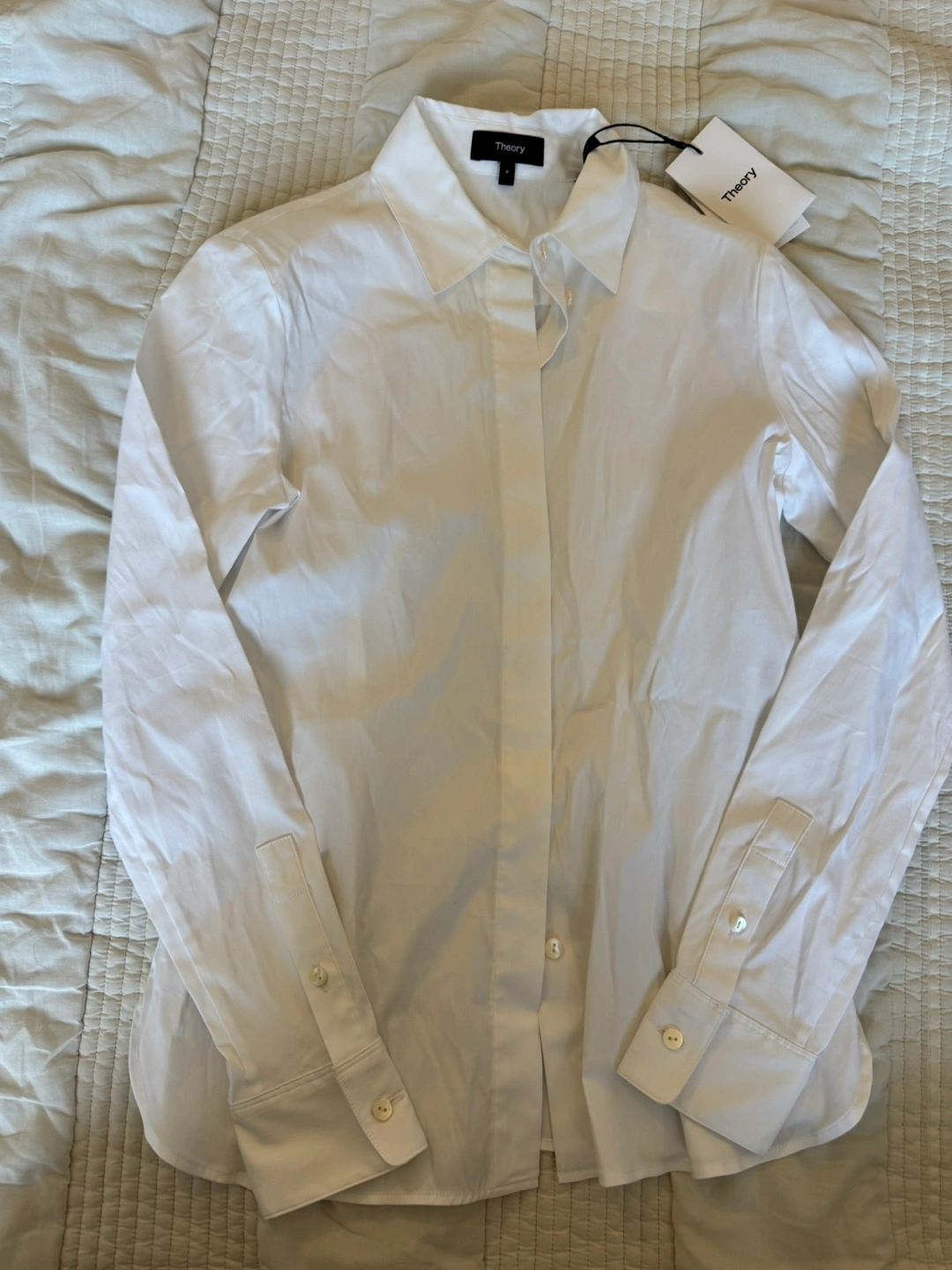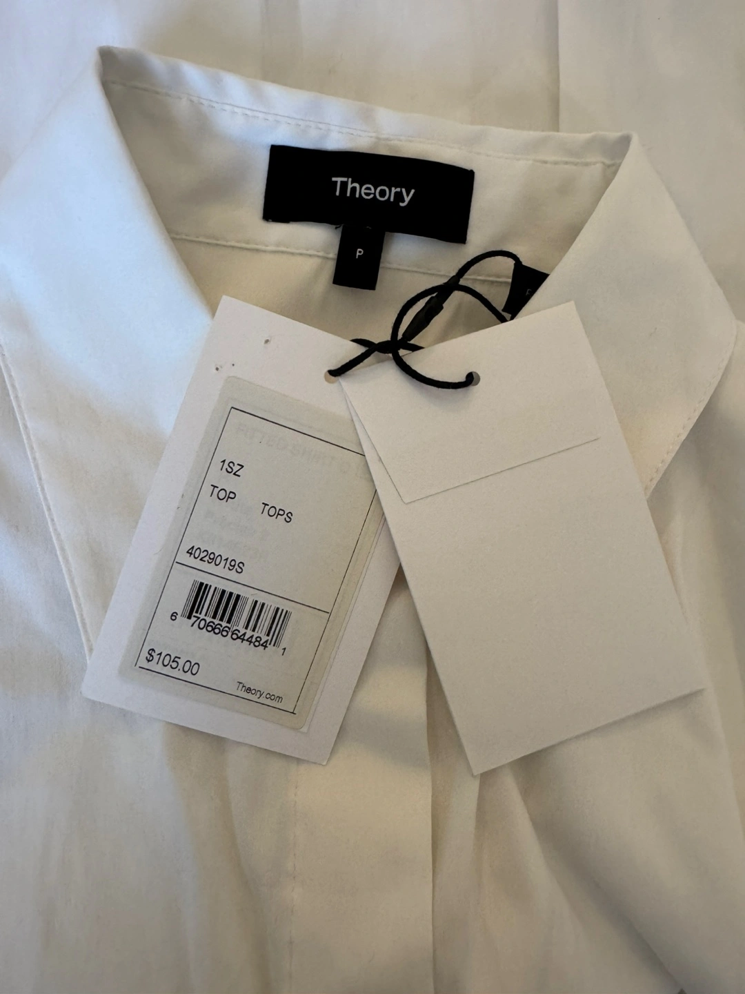 I'm selling a brand new Theory fitted shirt! It's a crisp white color and a size P. The shell is made of 78% cotton, 19% nylon, and 3% spandex. The style is a fitted shirt, precise 2# K014523R. Originally bought for $105