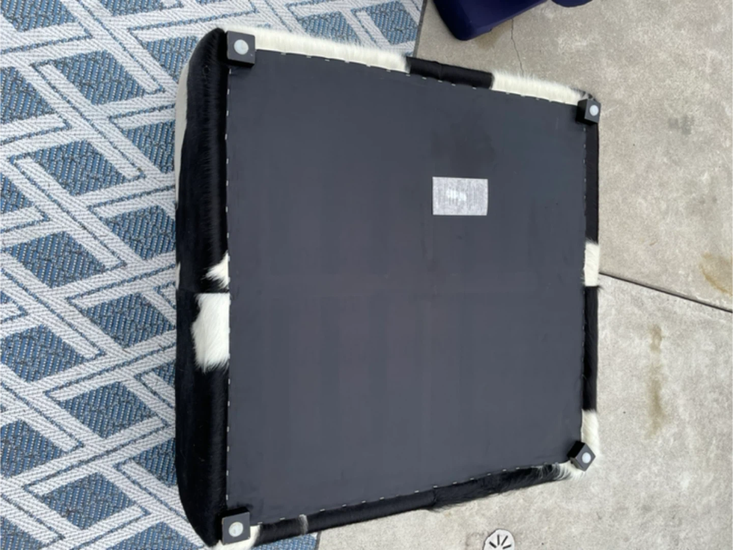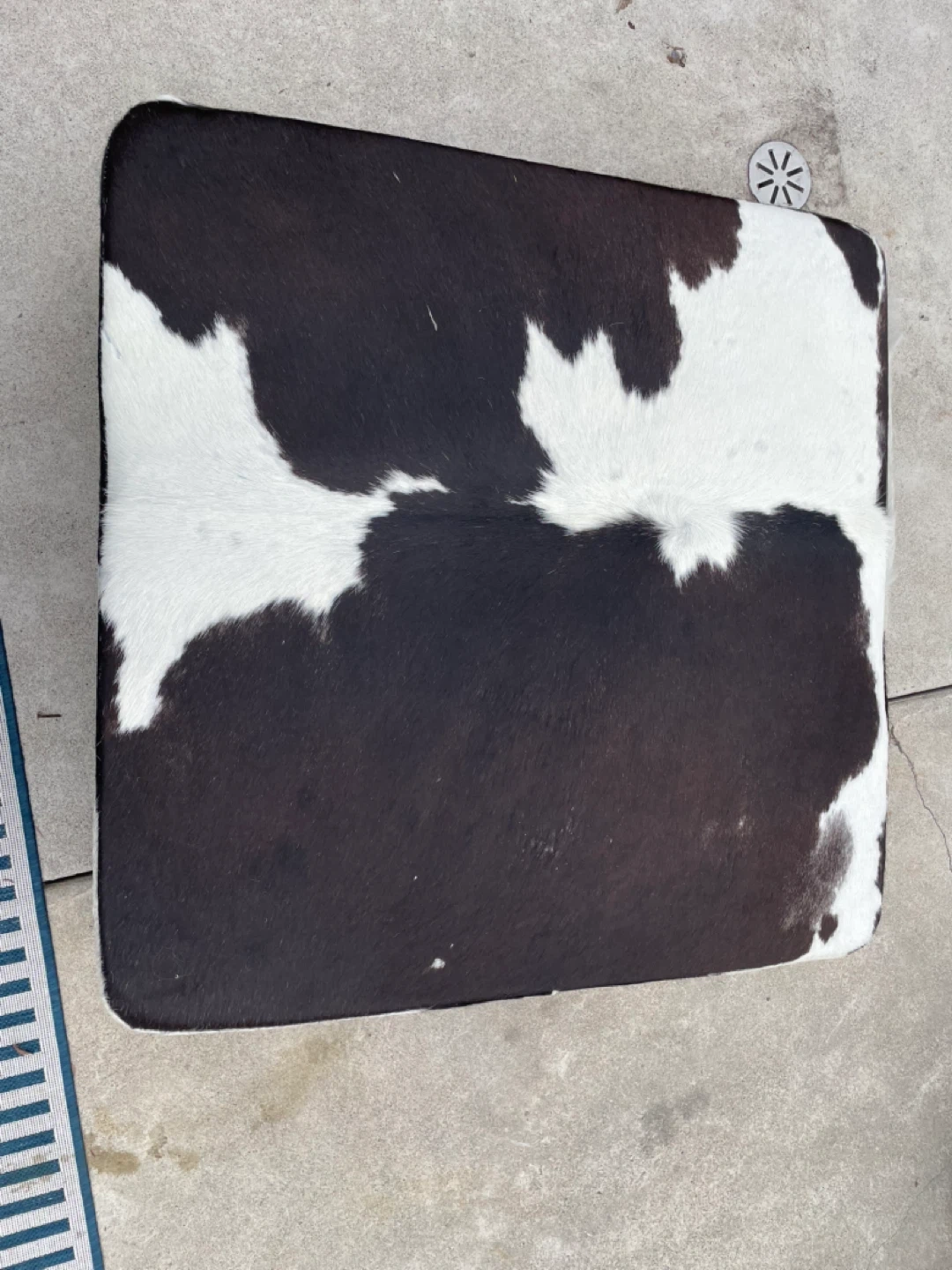 Selling a unique cowhide ottoman! It's in great condition and would add a fun touch to any room. The ottoman is sturdy and comfortable, perfect for resting your feet or as extra seating. It's a stylish piece that's sure to be a conversation starter!