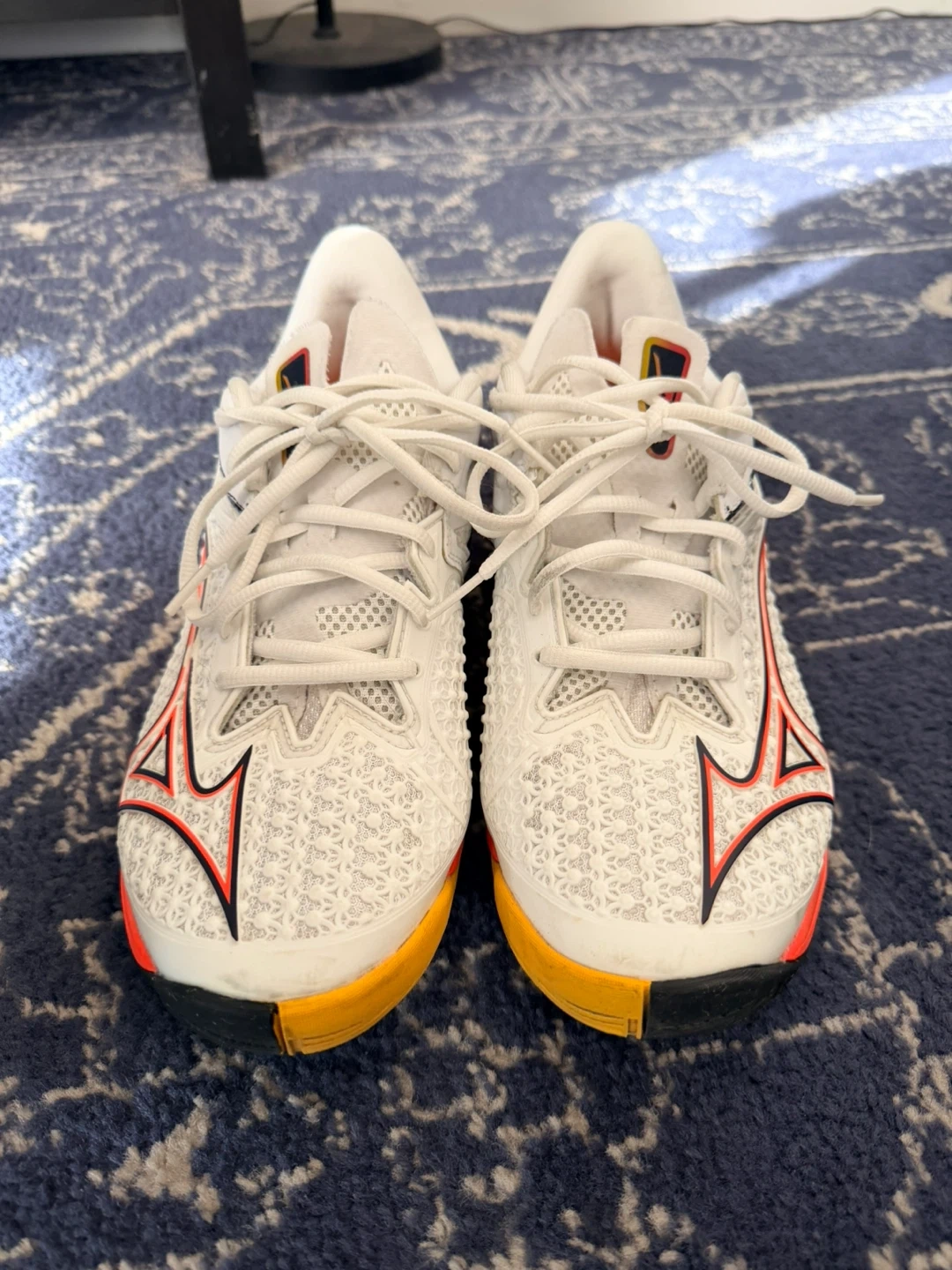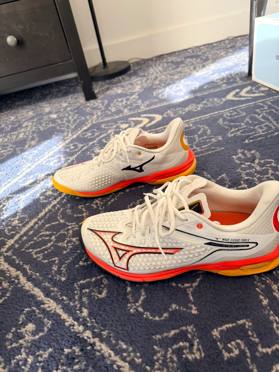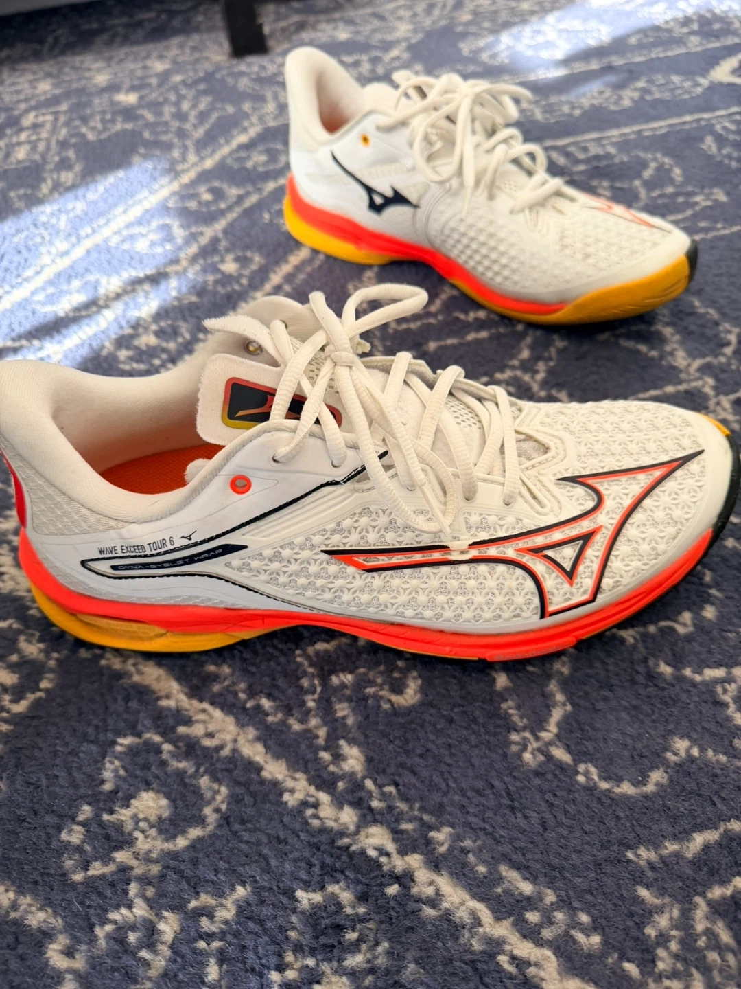 Selling a pair of Mizuno Wave Exceed Tour 6 tennis shoes that are US size 9. These are white with orange and yellow accents. I’ve recently replaced the insert soles with Sofsole athelete for good cushion and used once. Super light and responsive. They are in good condition and ready for the court!