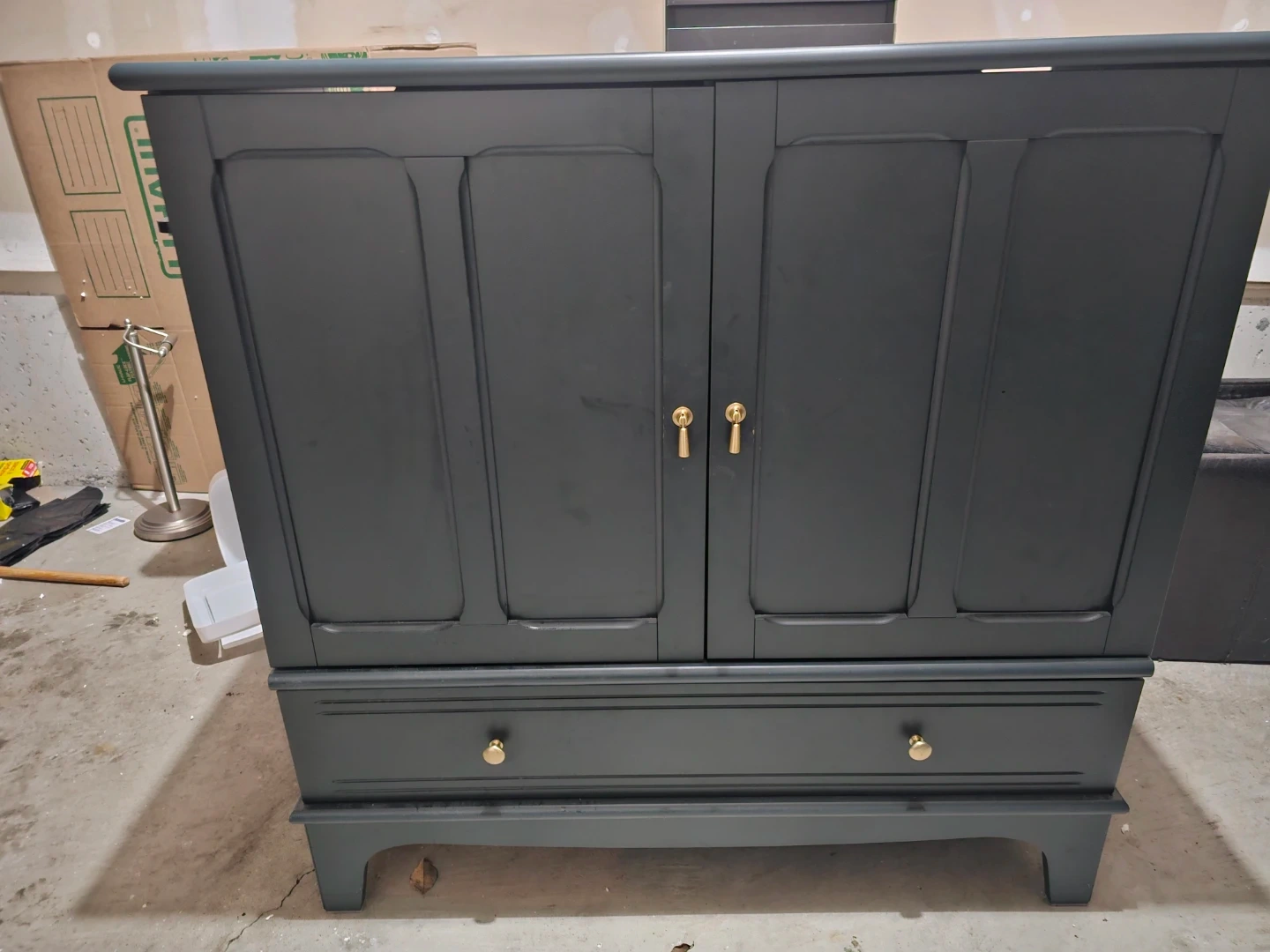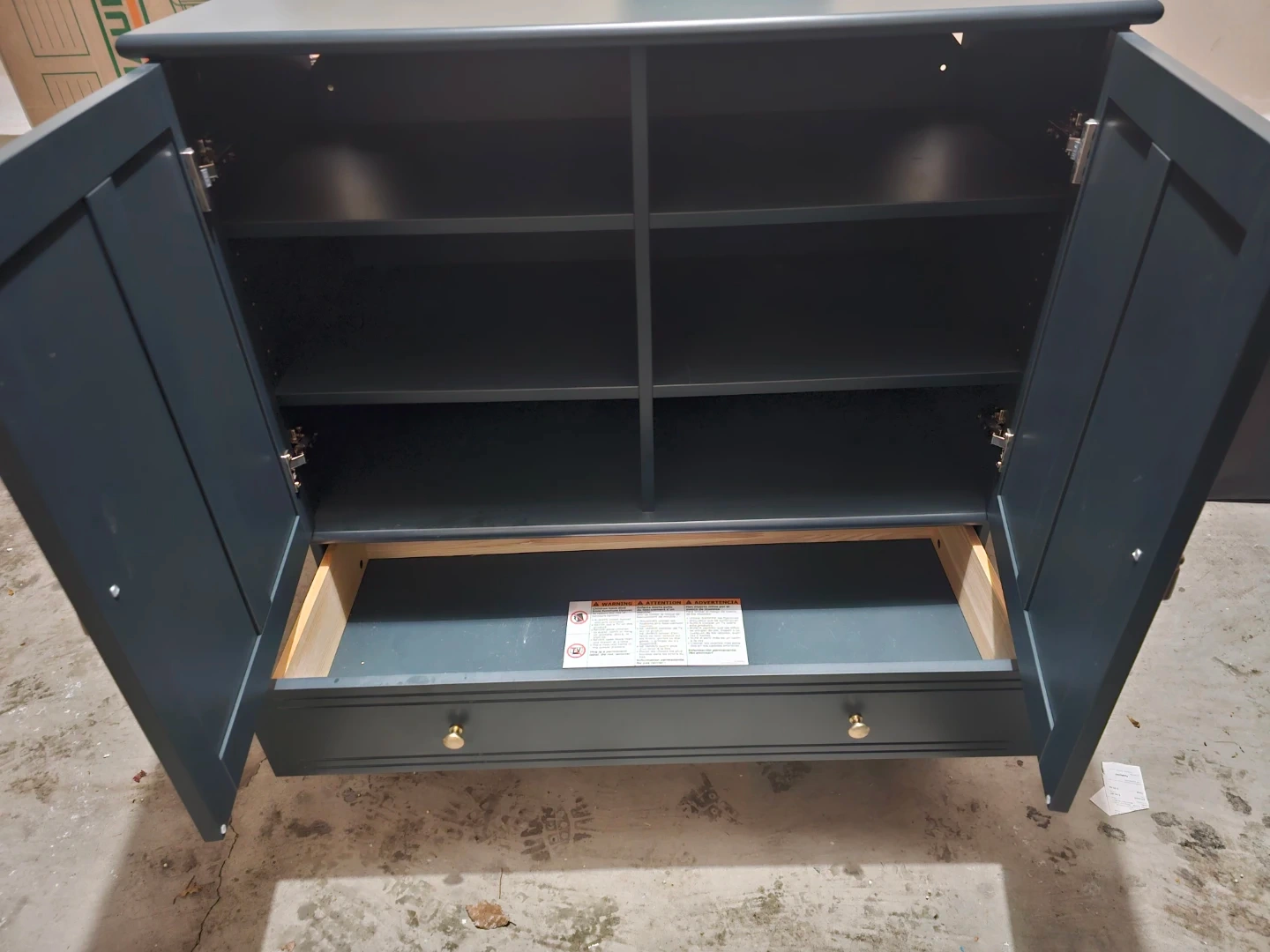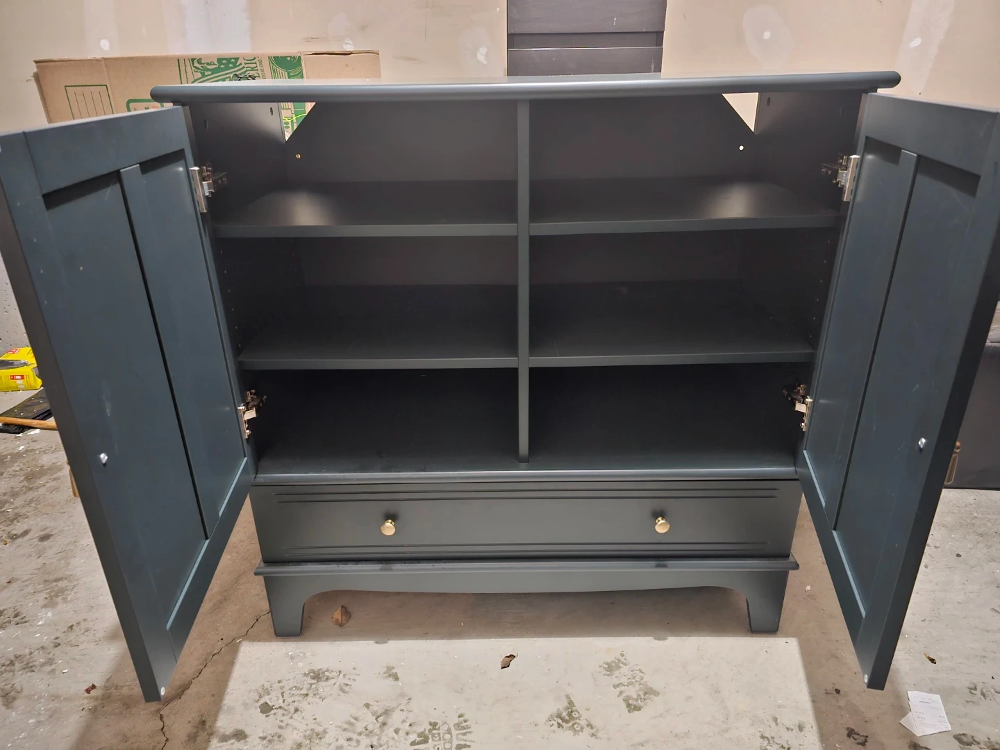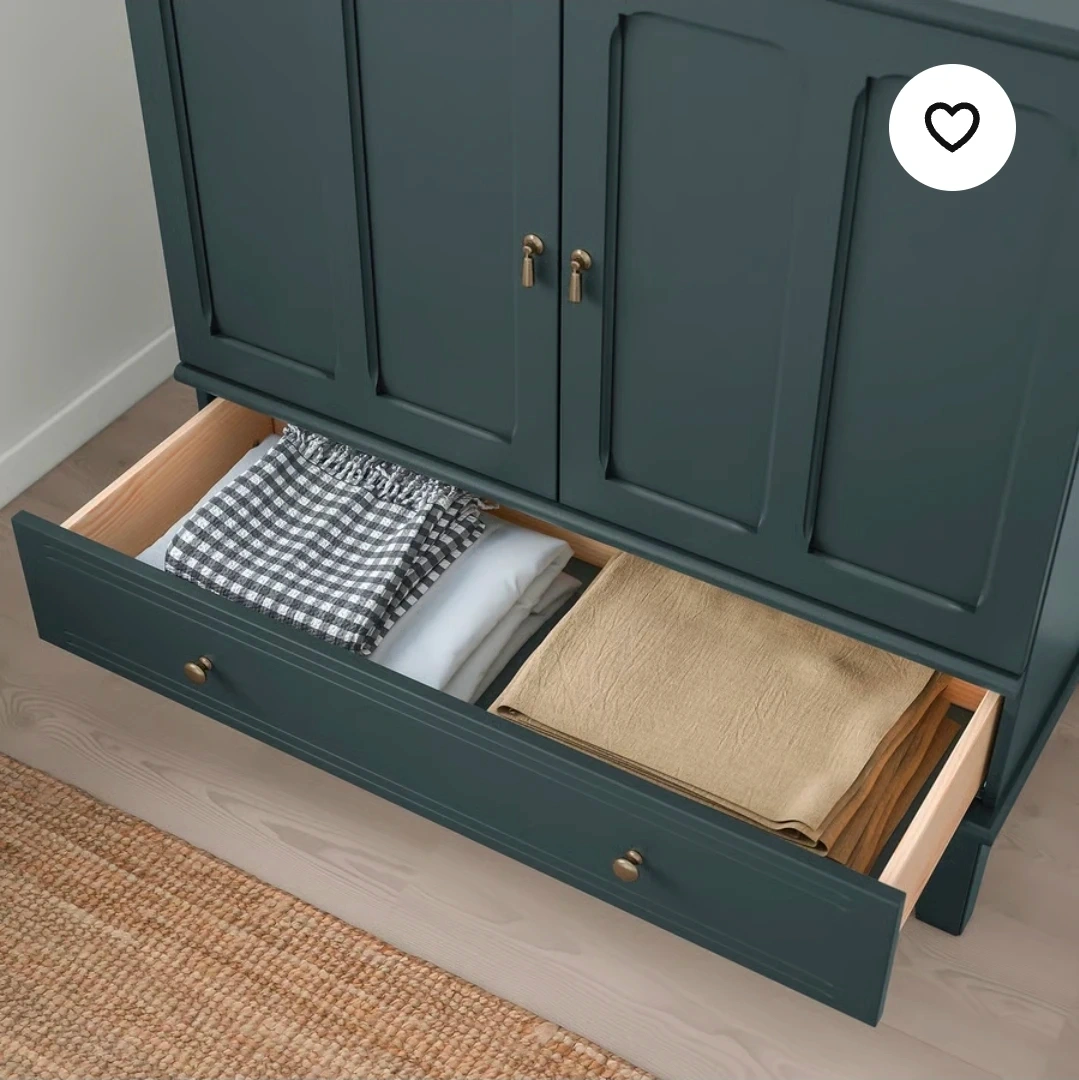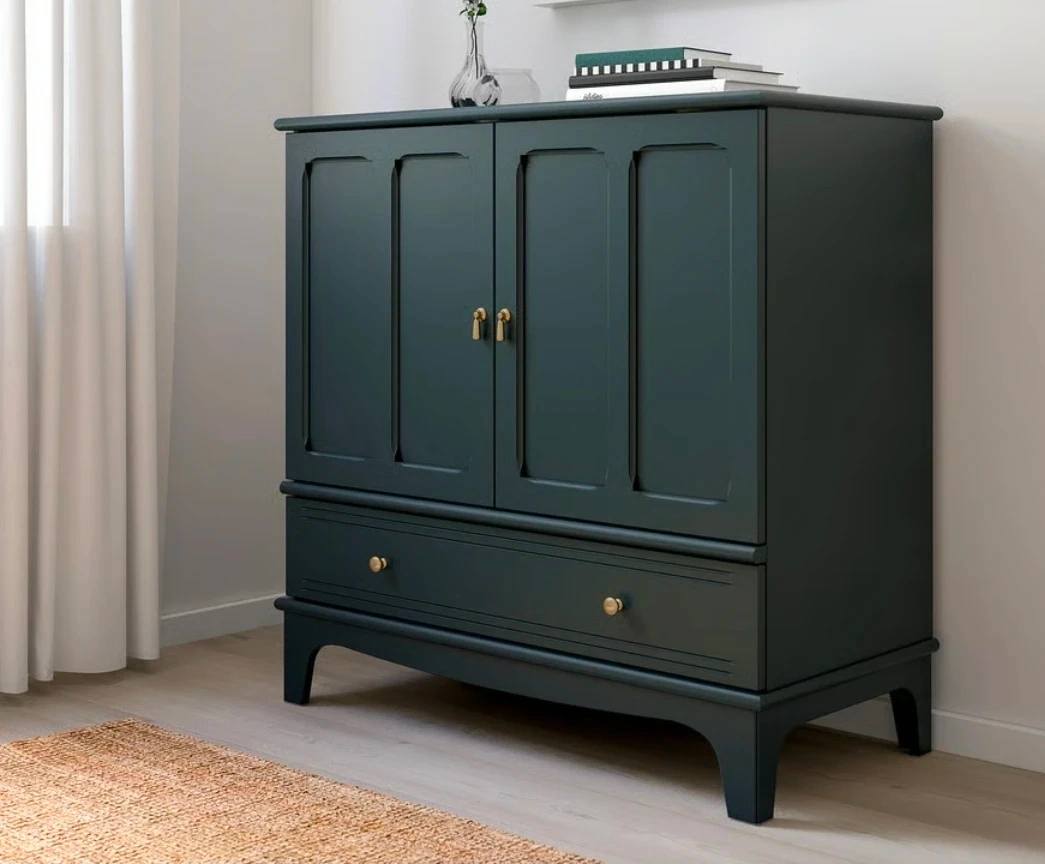 This dark green cabinet features two doors and a drawer, perfect for storage.