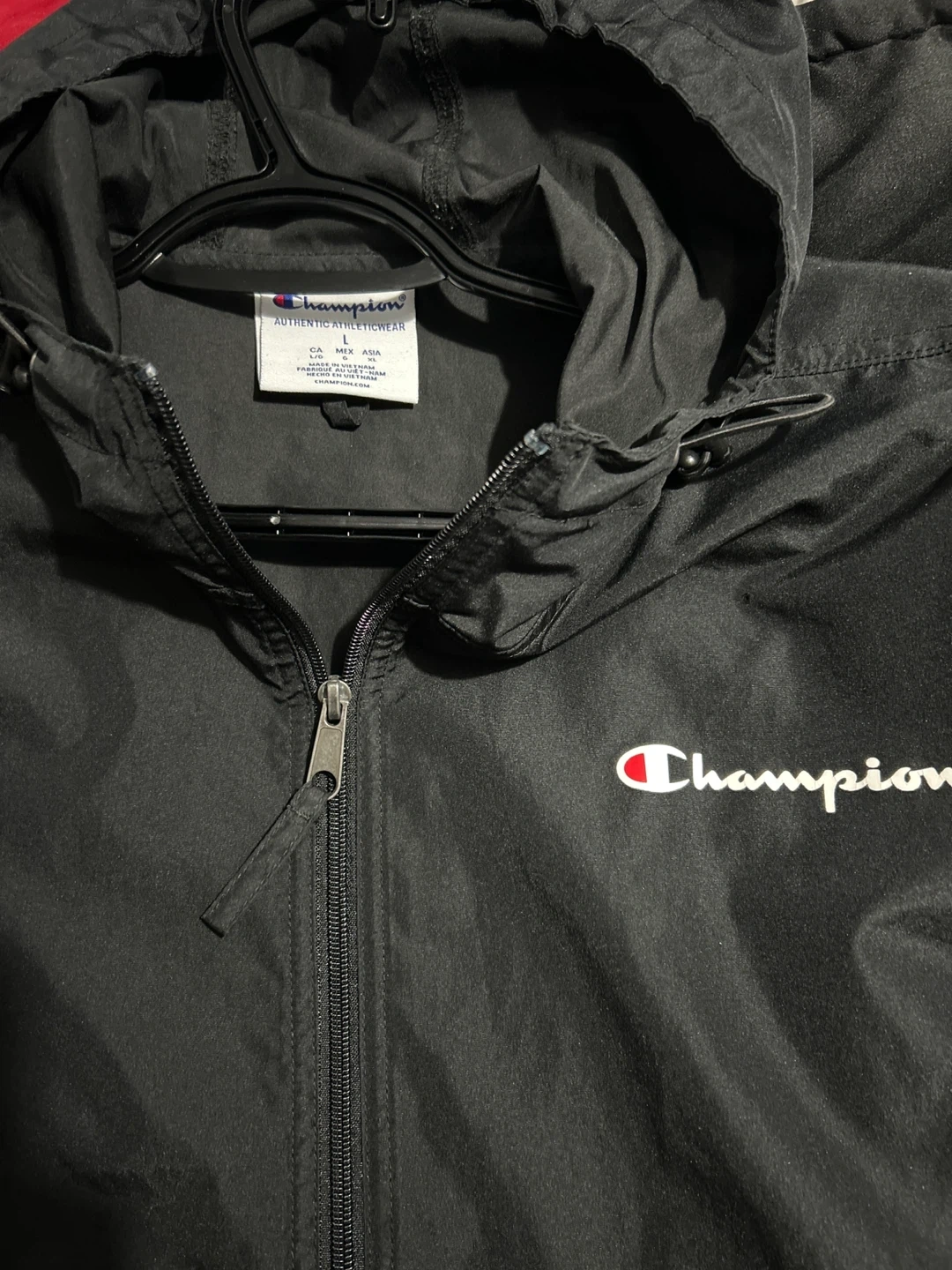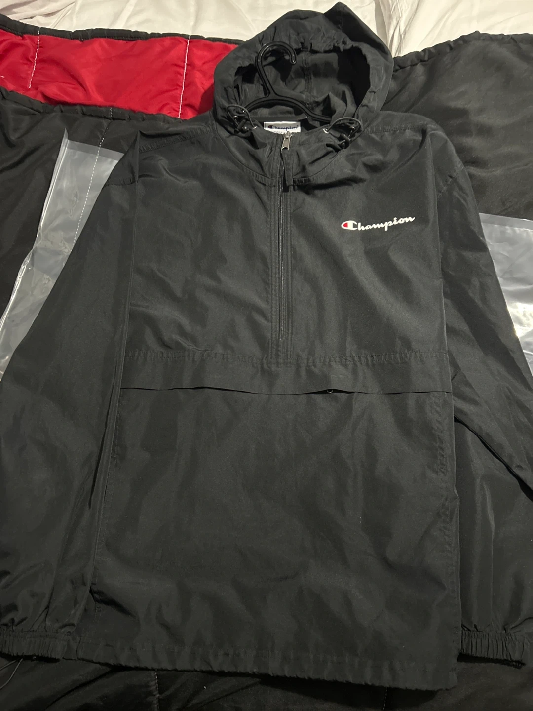 Selling a Champion black pullover jacket in excellent condition! This is a size L. It's a lightweight and stylish jacket perfect for everyday wear.
