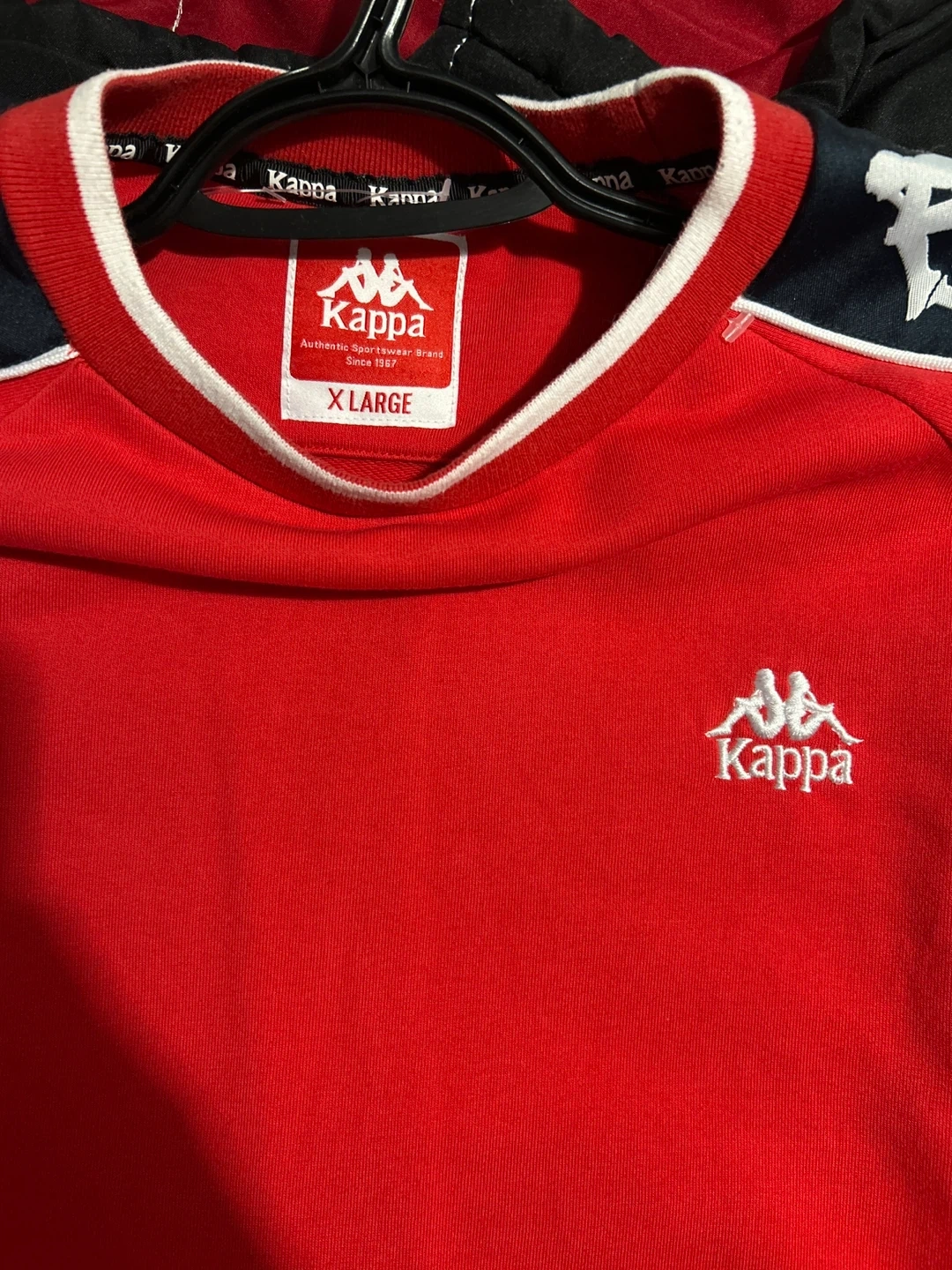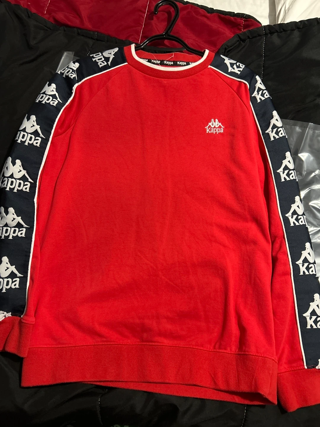 Selling a Kappa red sweatshirt in excellent condition. It's a size XLarge and features the classic Kappa logo on the sleeves and chest. Perfect for casual wear!