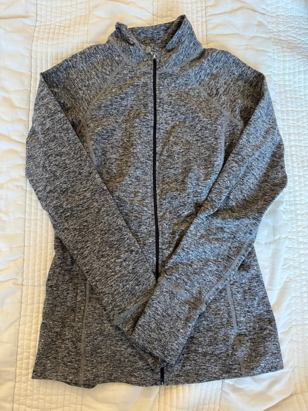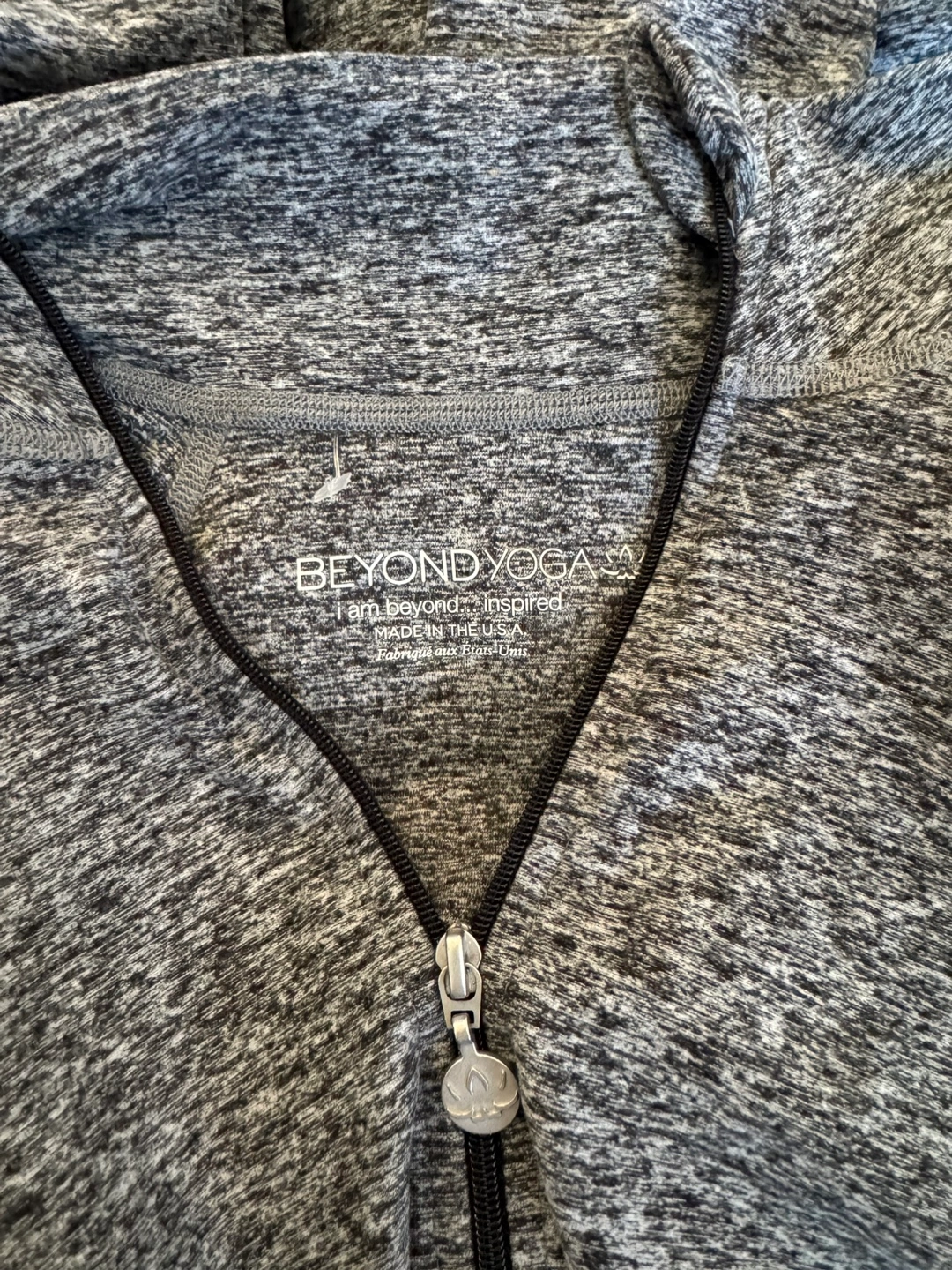 Selling a Beyond Yoga jacket in gray! It's made of 87% polyester and 13% spandex. Size is small.