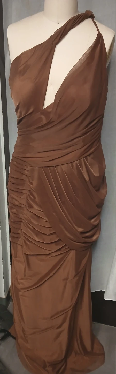 Here's a lovely brown dress with a unique one-shoulder design. It features a draped and ruched style that adds a touch of elegance. Perfect for a special occasion!