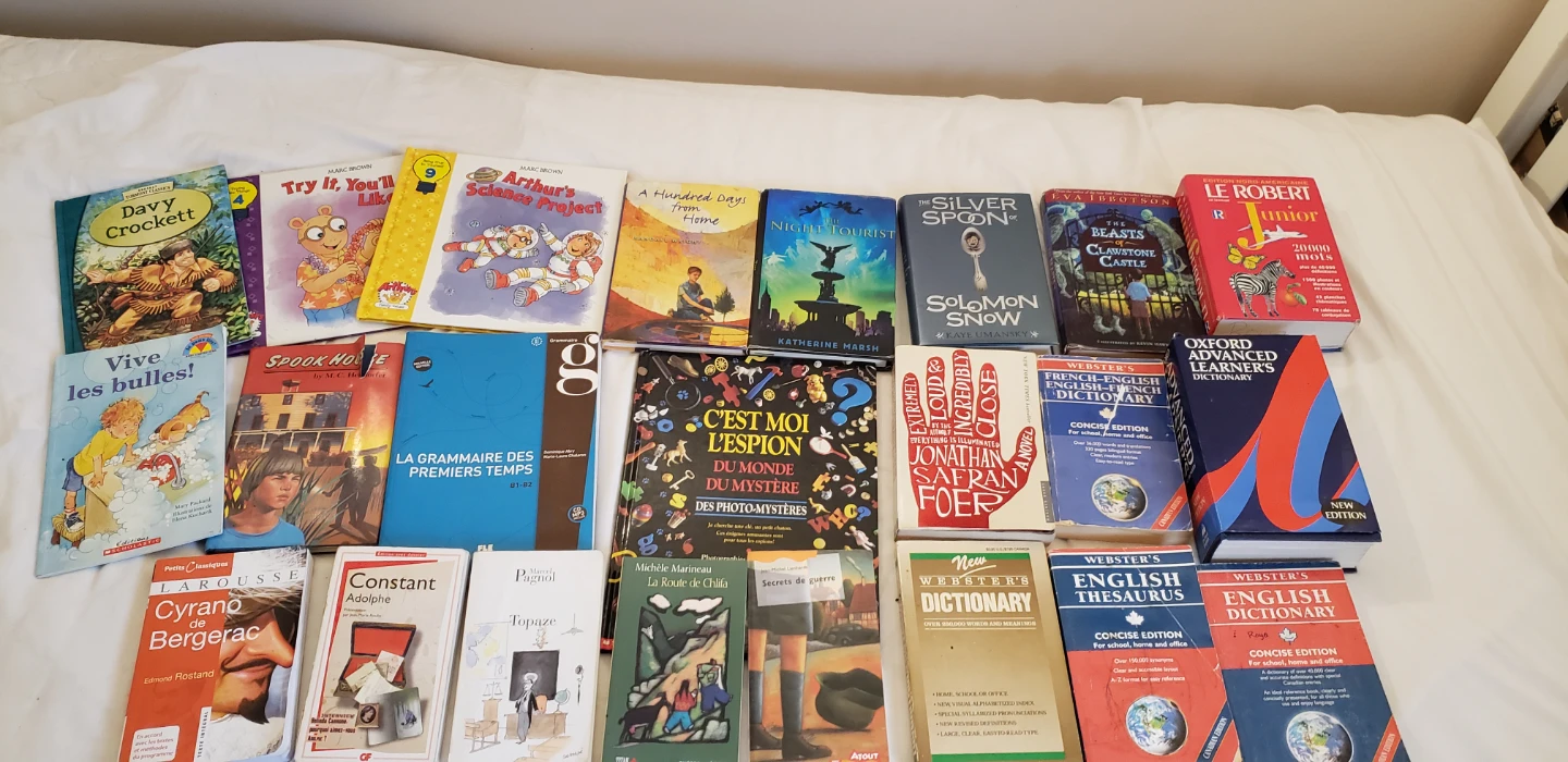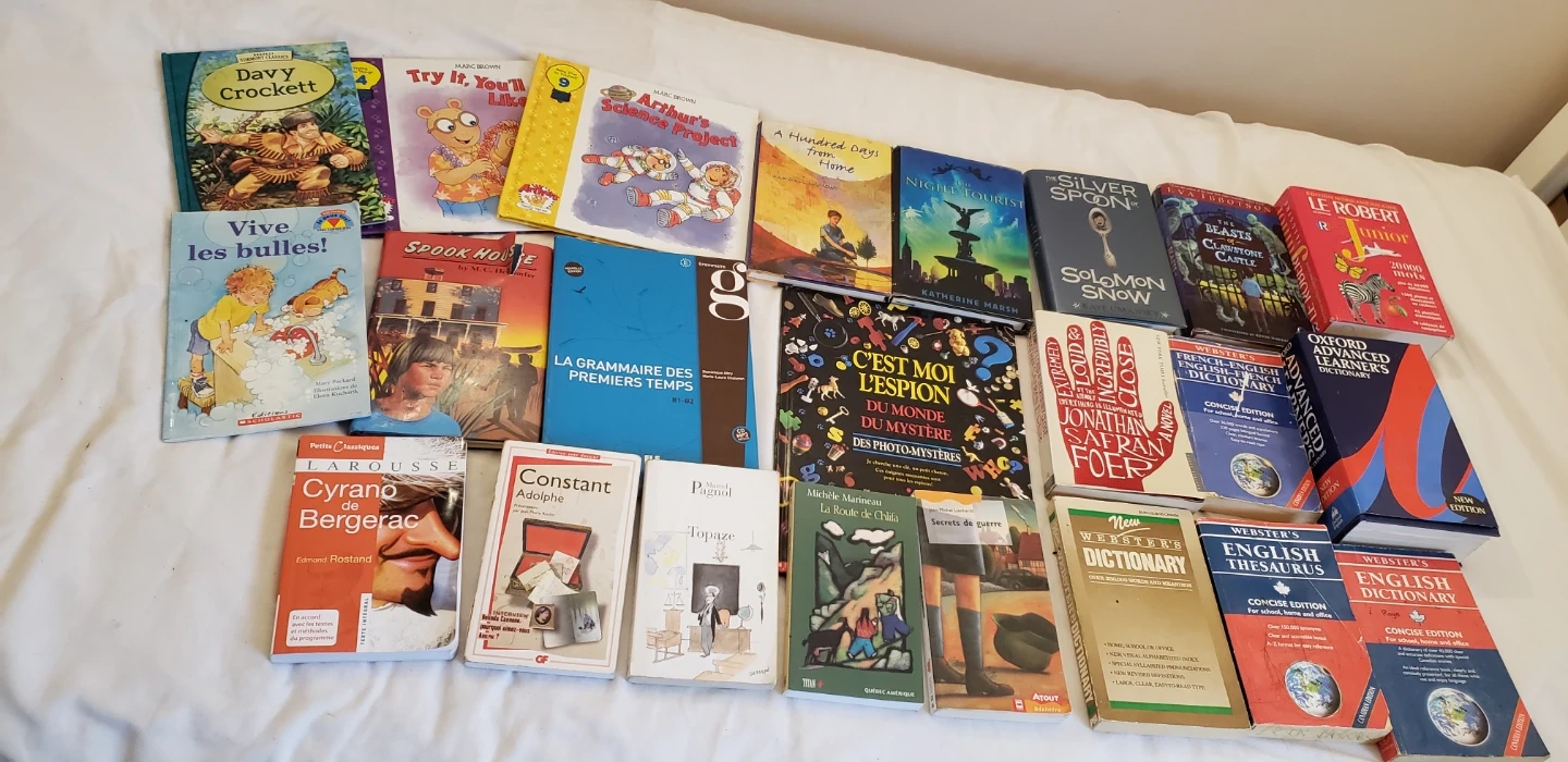 Selling a mixed lot of books! Titles include Davy Crockett, Try If You Like, Arthur's Science Project, A Hundred Secret Places, Night Tourist, Silver Spoon, Beasts of Clawstone Castle, Le Robert Junior, Vive les bulles!, Spook House, La Grammaire des Premiers Temps, C'est moi l'espion, Extremely Loud and Incredibly Close, French-English Dictionary, Oxford Advanced Learner's Dictionary, Cyrano de Bergerac, Constant Adolphe, Topaze, Michele Marineau La Route de Chlale, Secrets de guerre, Webster's Dictionary, Webster's Thesaurus, Webster's English Dictionary