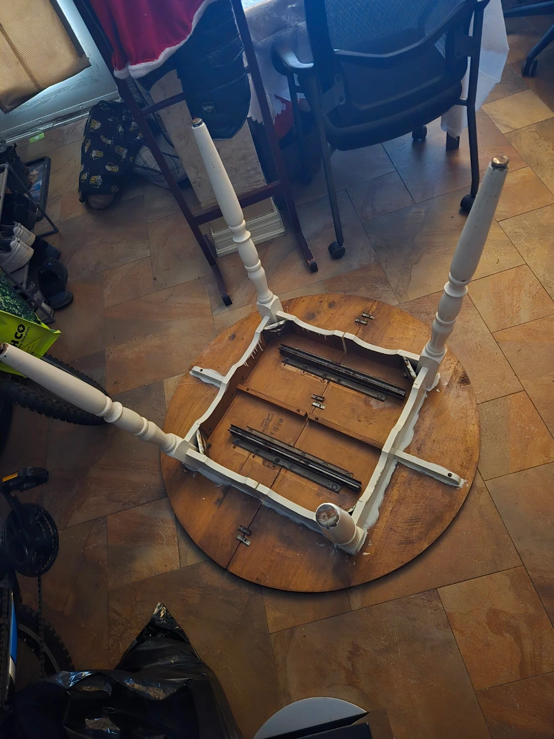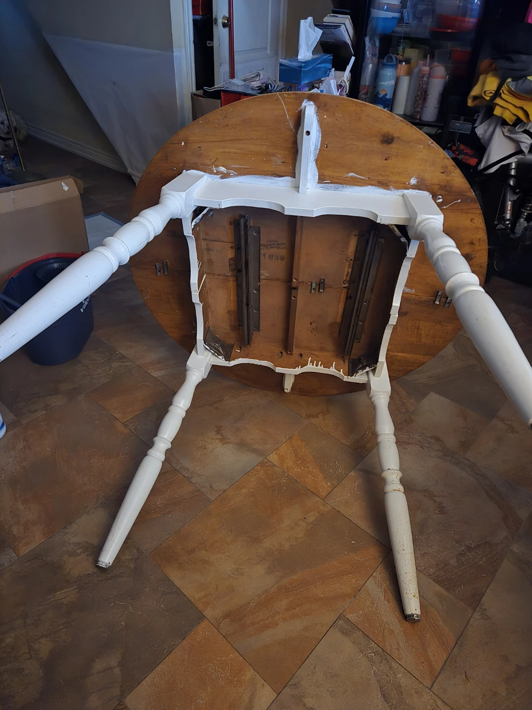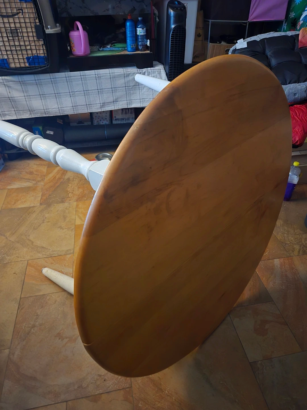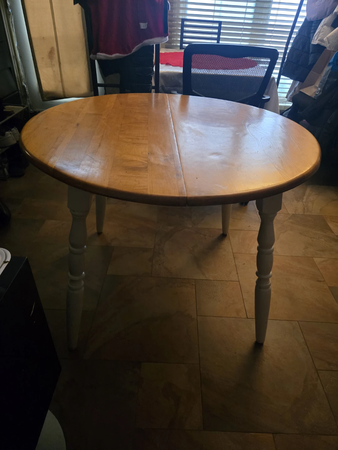 Selling a round wooden dining table with white painted legs. It's in used condition, but still has a lot of life left in it. Perfect for a small dining area or kitchen