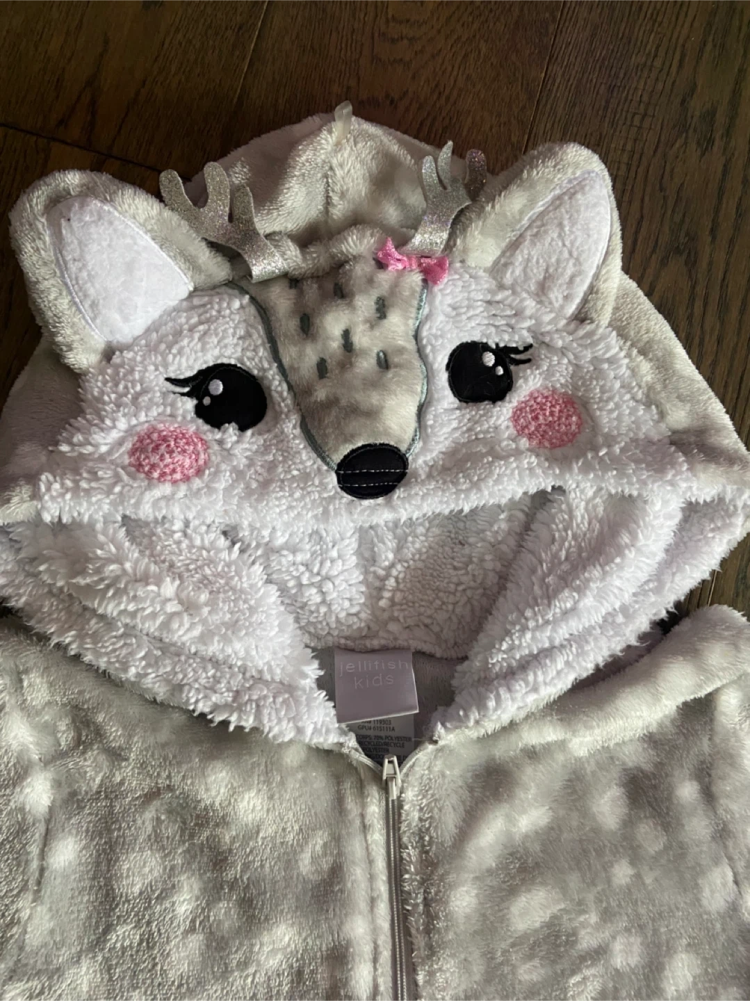 Super cute Jellyfish Kids onesie with a deer design! It's in excellent condition and perfect for keeping cozy. The onesie is grey with white spots and has an adorable deer hood. Size 10/12. EUC and smk-free. Pick up north end St Catharines near Vine/Linwell