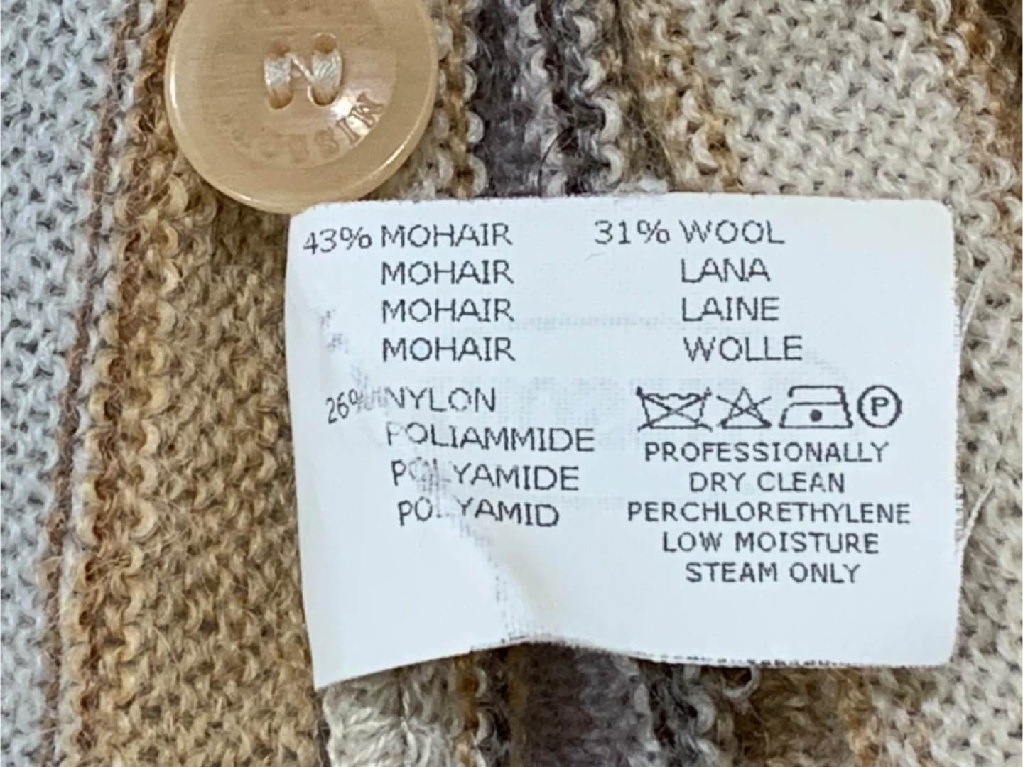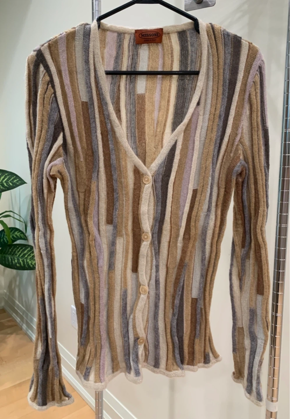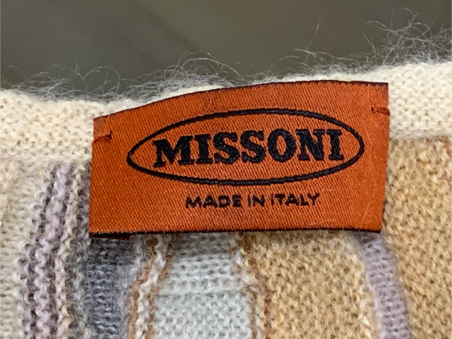 Design: Vertical wavy stripes (a variation of their famous zigzag) in earth tones (beige, grey, lilac, tan). Perfect for winter layering.