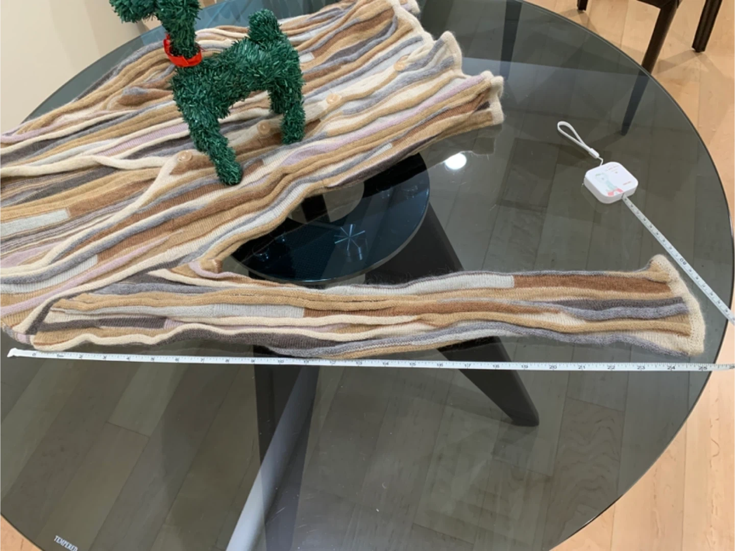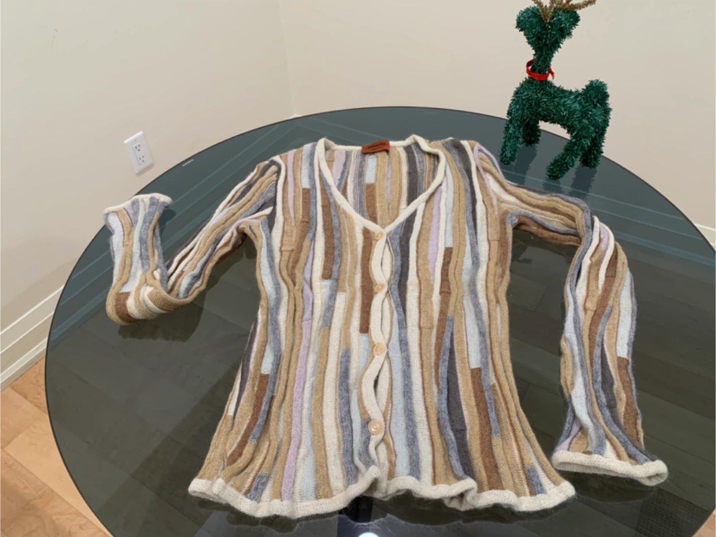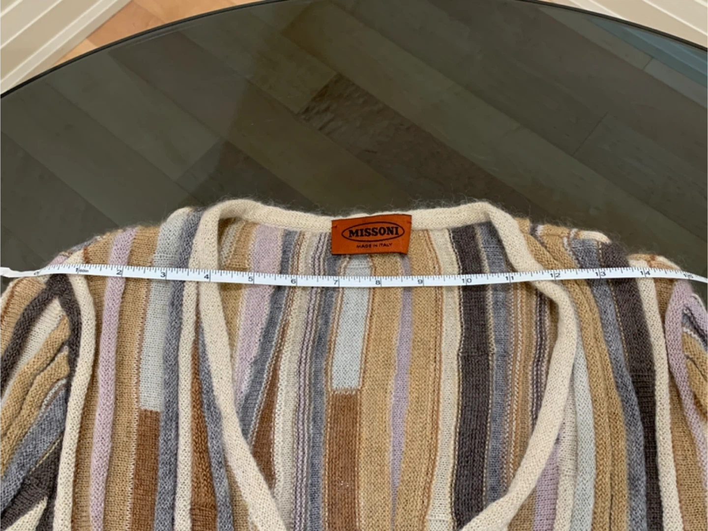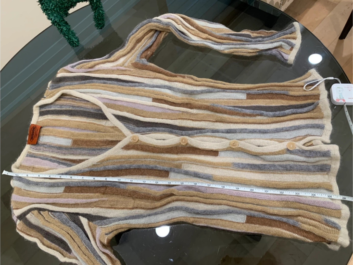 Design: Vertical wavy stripes (a variation of their famous zigzag) in earth tones (beige, grey, lilac, tan). Perfect for winter layering.