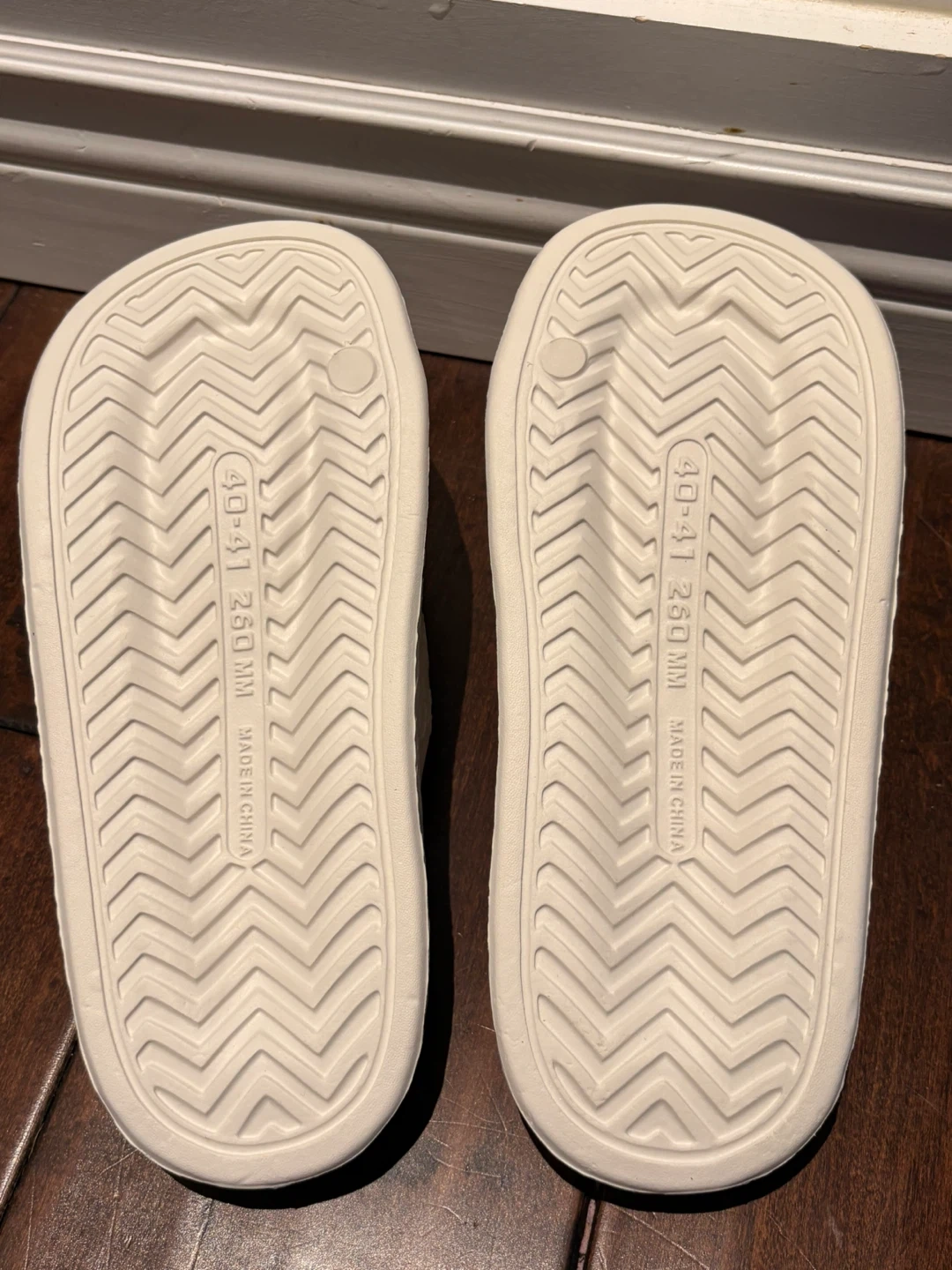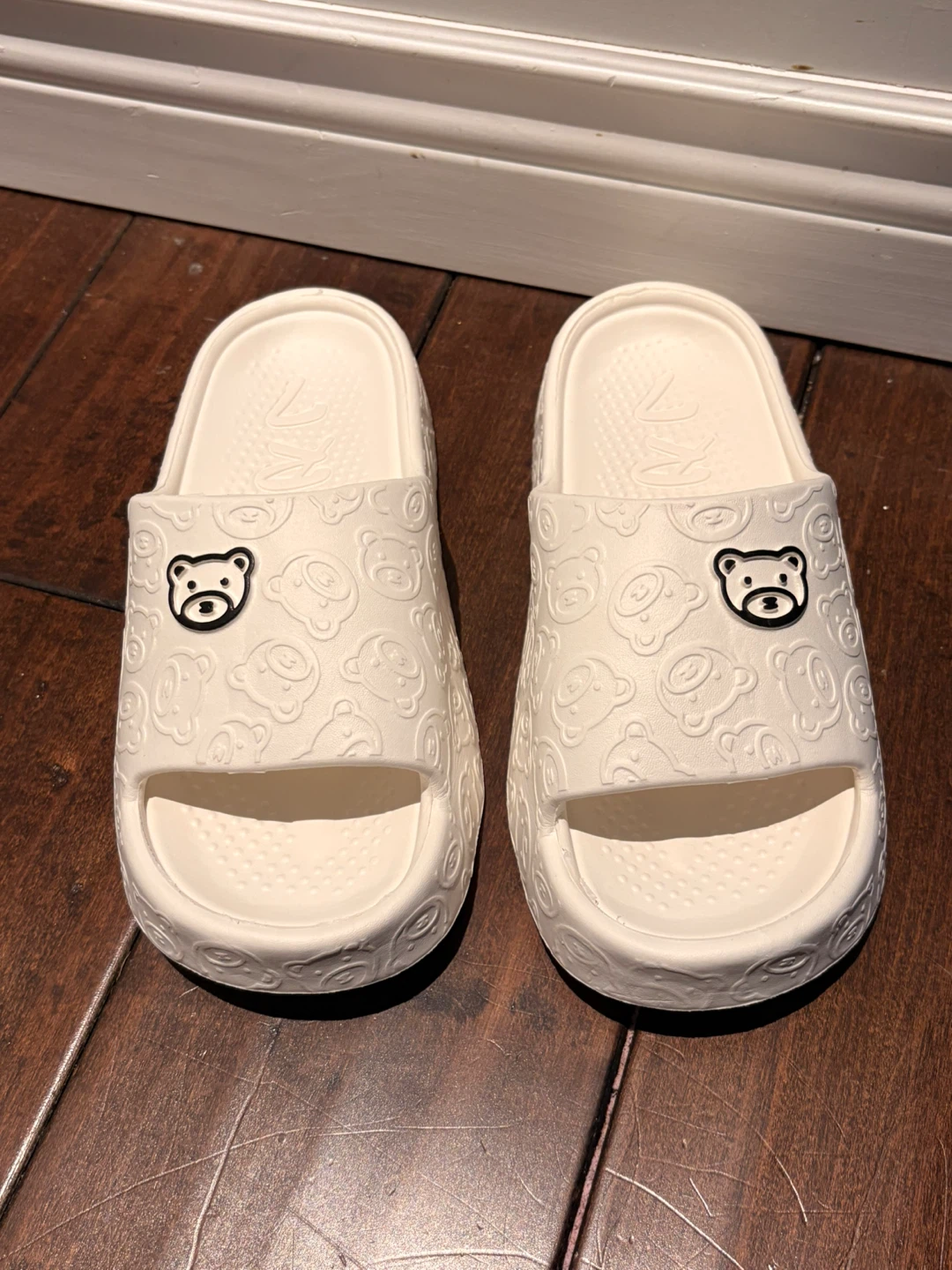 Cute white slides with a bear design! They're marked as size 40-41, which is approximately a US size 9-10. Perfect for indoor or outdoor wear