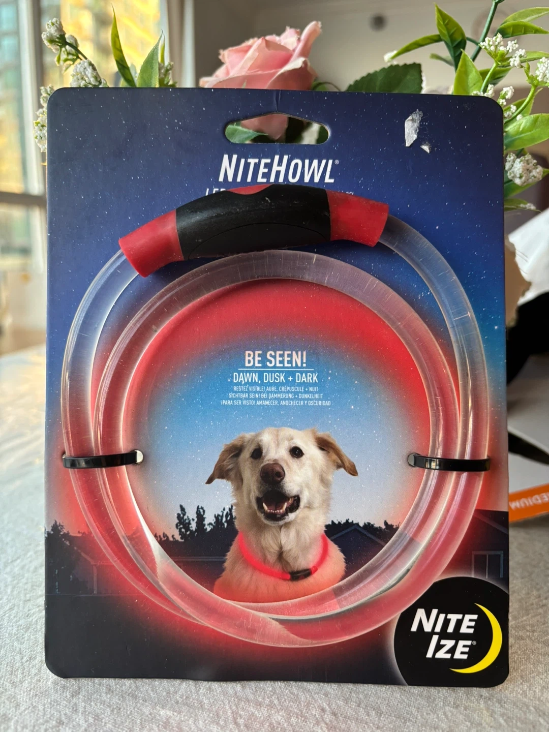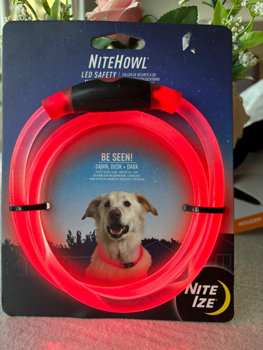 Keep your furry friend safe and visible with this NiteHowl LED safety collar! It's perfect for walks at dawn, dusk, or dark. The collar is designed to ensure your dog is seen and safe during low-light conditions. Great for any dog owner!
