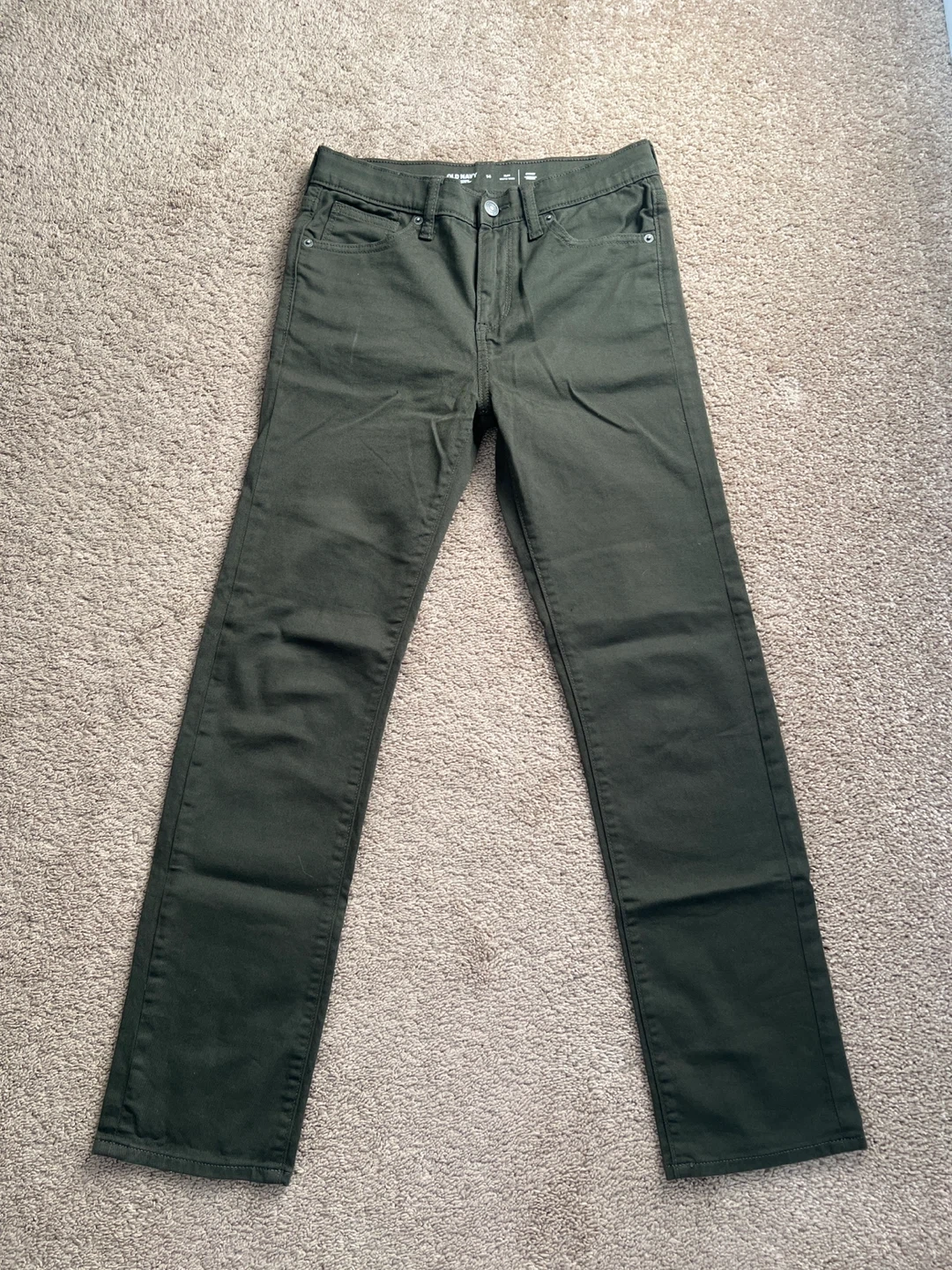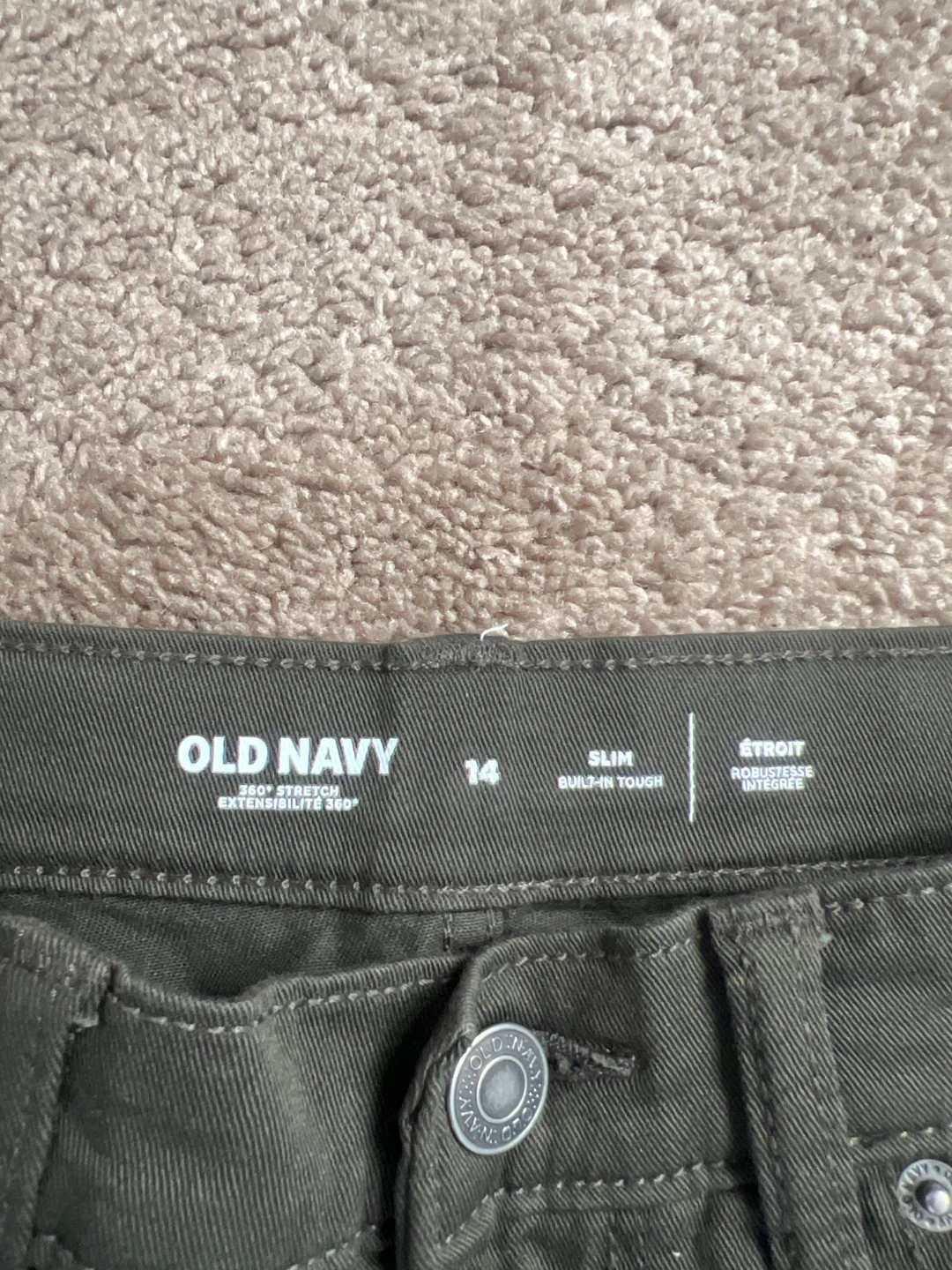 Selling a pair of Old Navy jeans in olive green! They're size 14 for youth & kids and have a slim fit to keep the fashion remarkable than ever. The material has a 360° stretch, making them super comfy and robust for all-day purposes!