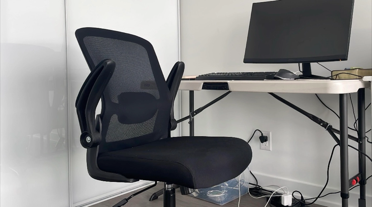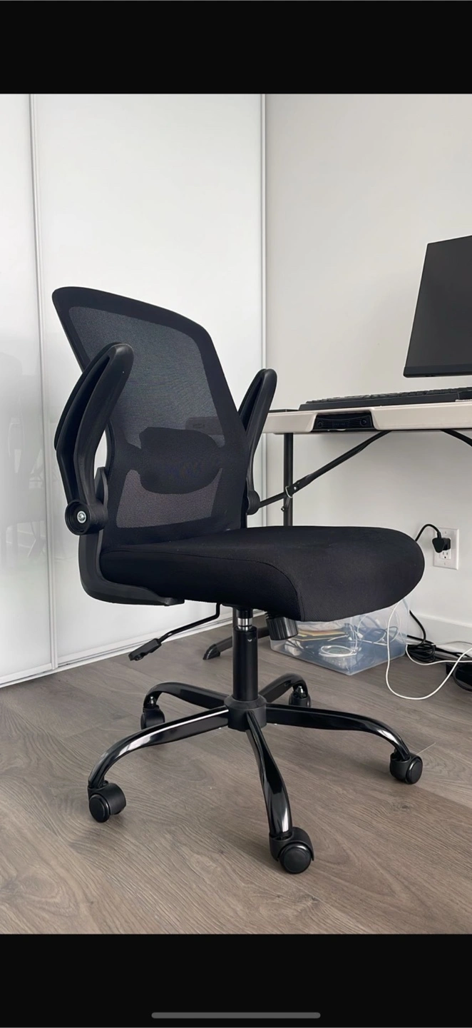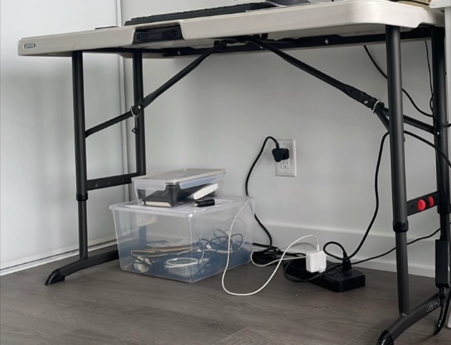 Table- White plastic top and metal legs. Great for work from home setup. Can easily keep 2 laptops, books, flowers, and what not. This is not battery operated so the manual adjusting of the table has to be done using red buttons on the side of the legs.