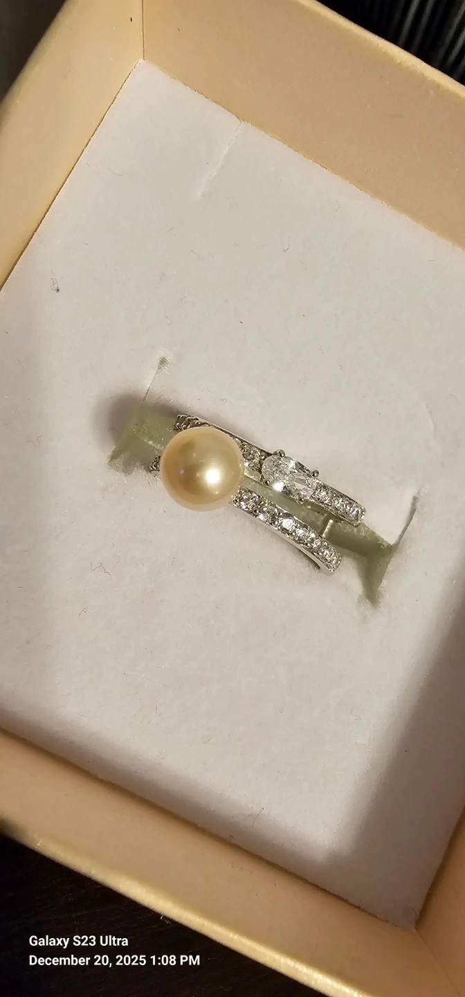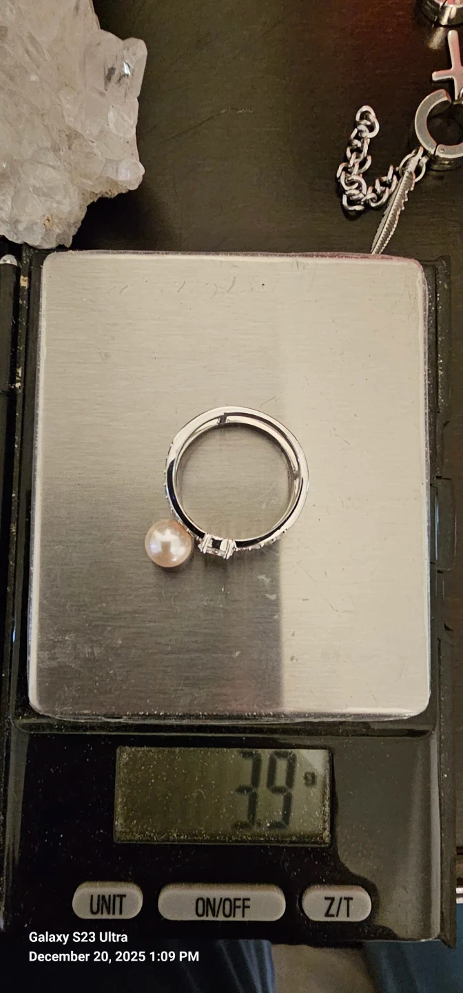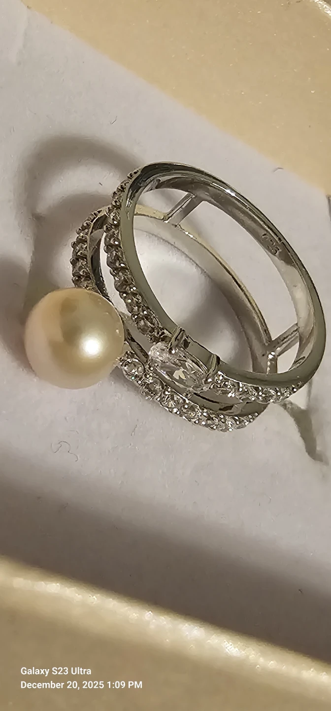 925 sterling silver ring featuring a classic pearl centerpiece with diamond accents along the band. Elegant and timeless design. Stamped 925 (see photos). Weight approx. 3.9 g. In good