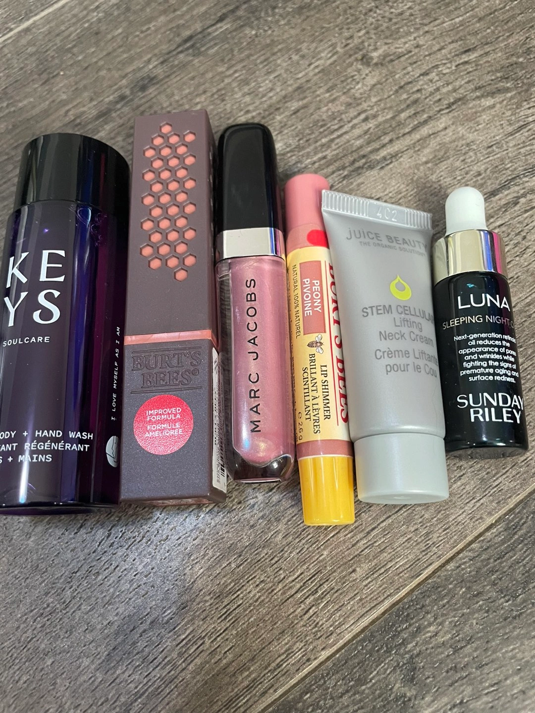 3 brand new lips x2 burts bees (full size) and 1 marc jacob lip, keys soulcare hand and body wash, juice beauty stem cellular neck cream, luna sleeping night oil