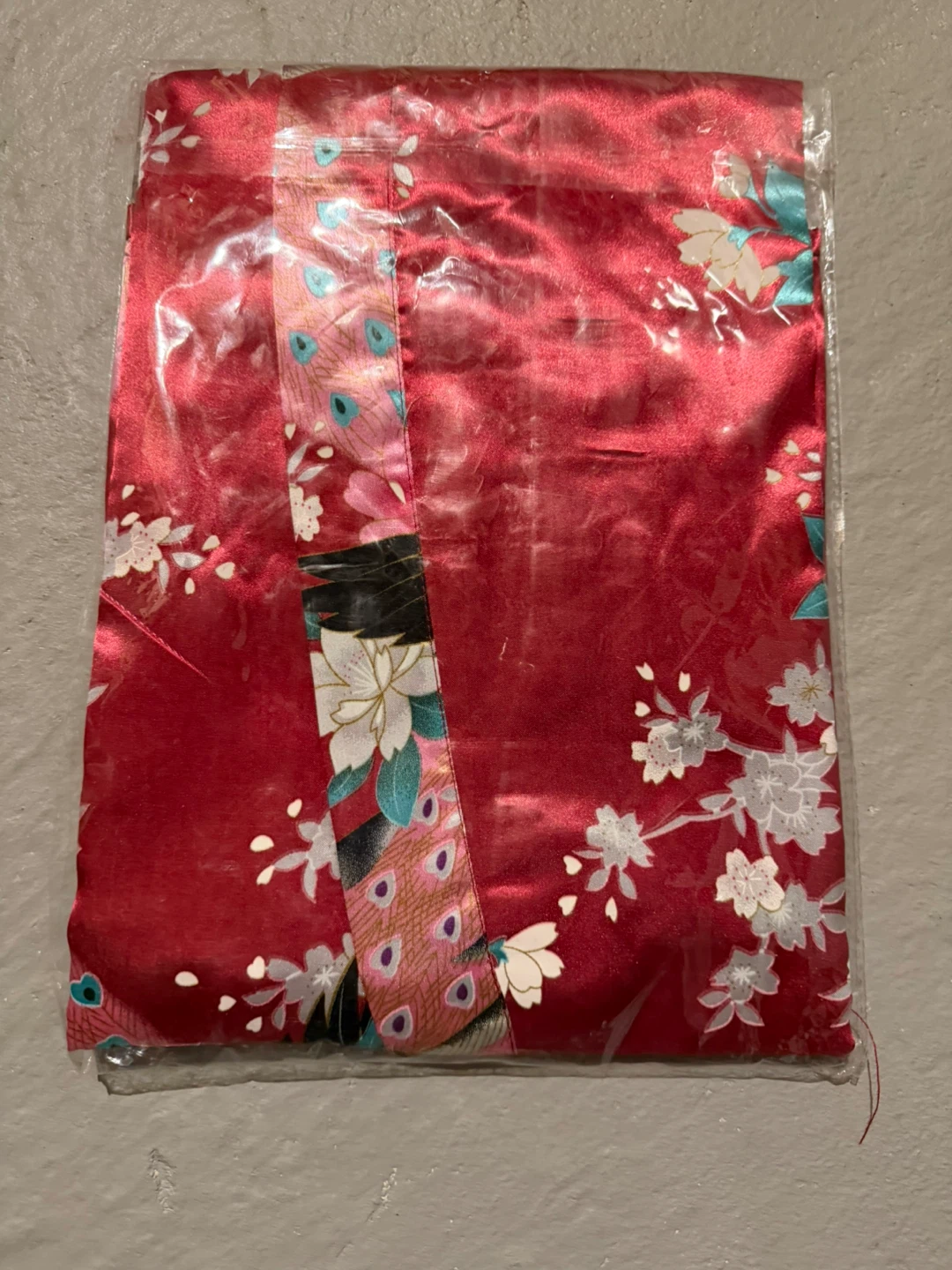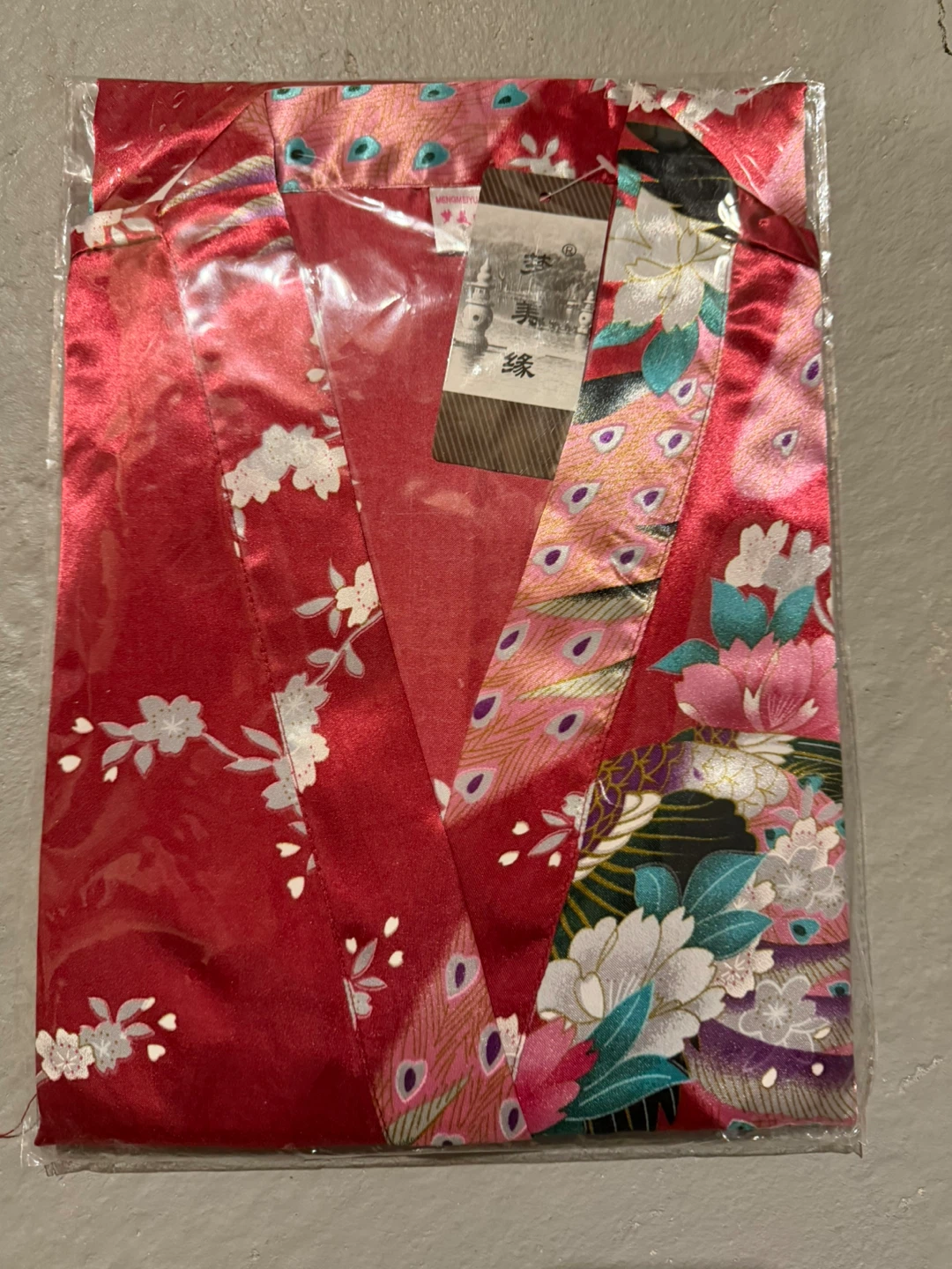 Selling a brand new, still-in-package red floral kimono robe! The robe features a beautiful floral and peacock feather design. It's perfect for lounging around the house or as a stylish cover-up
