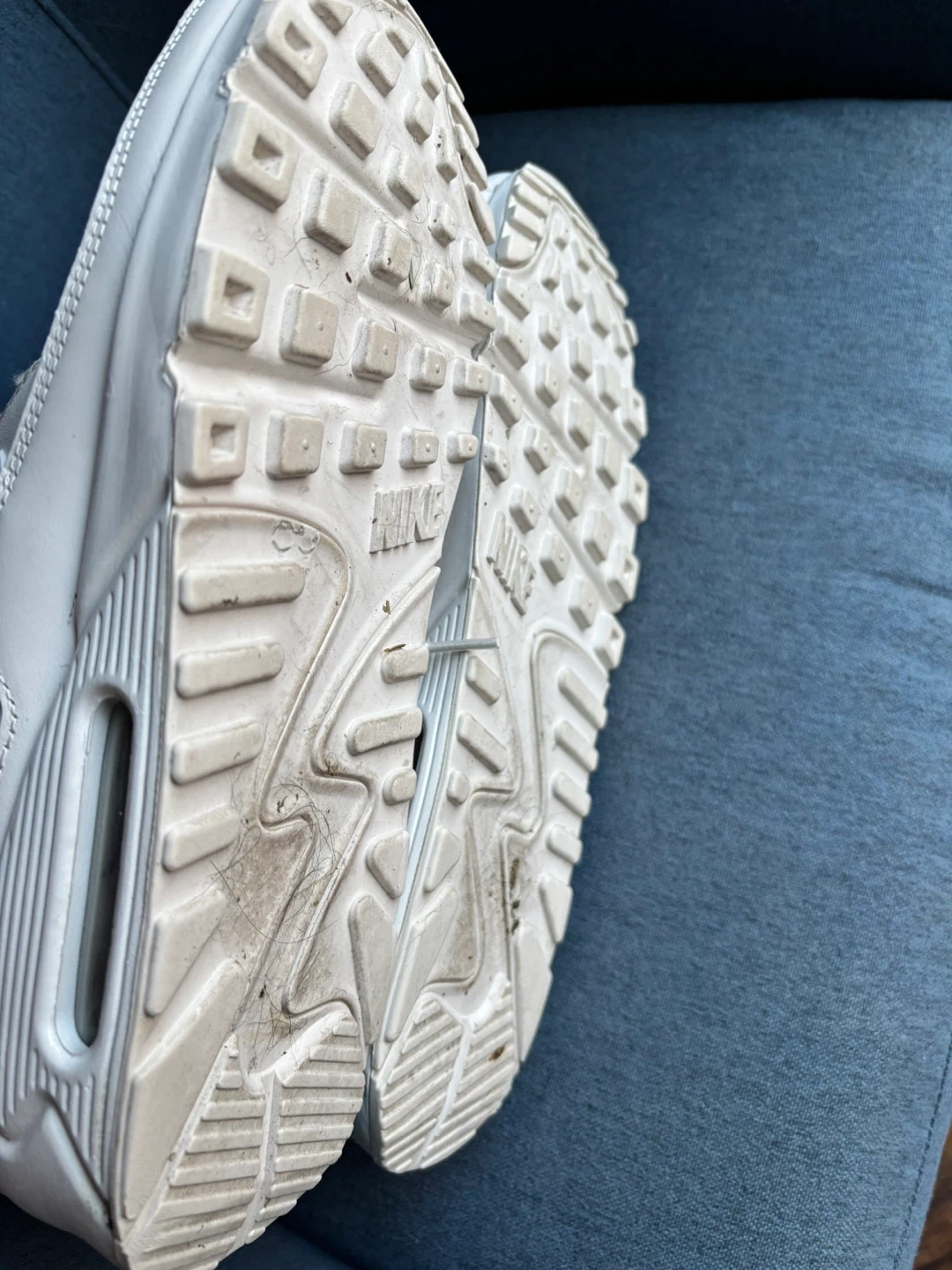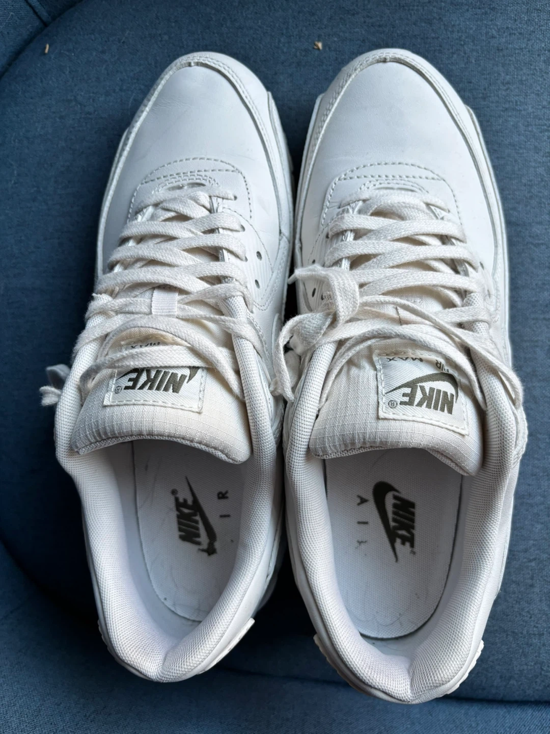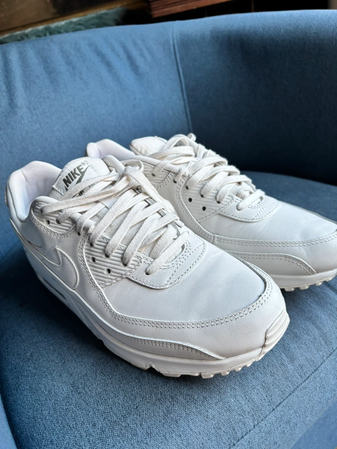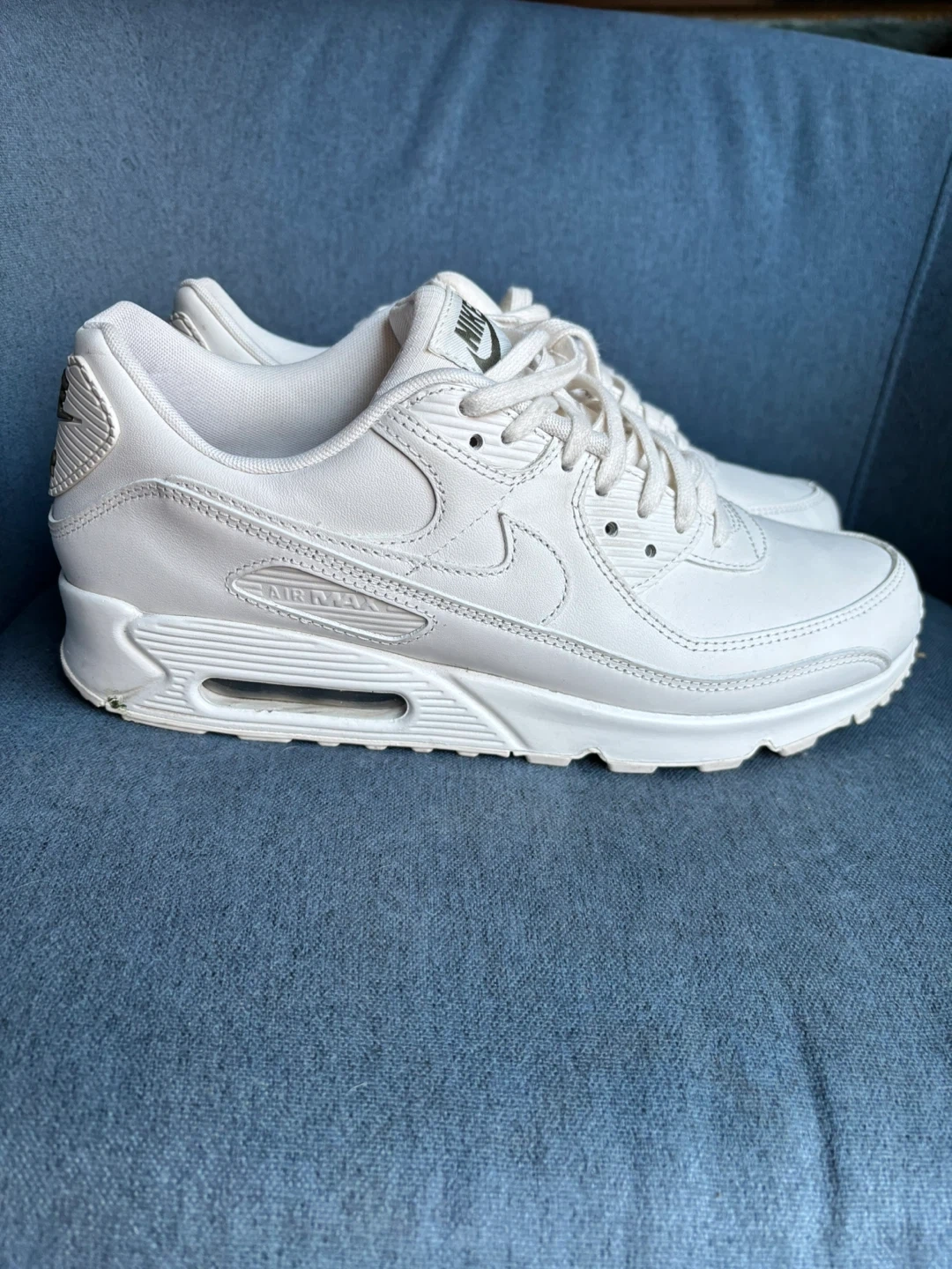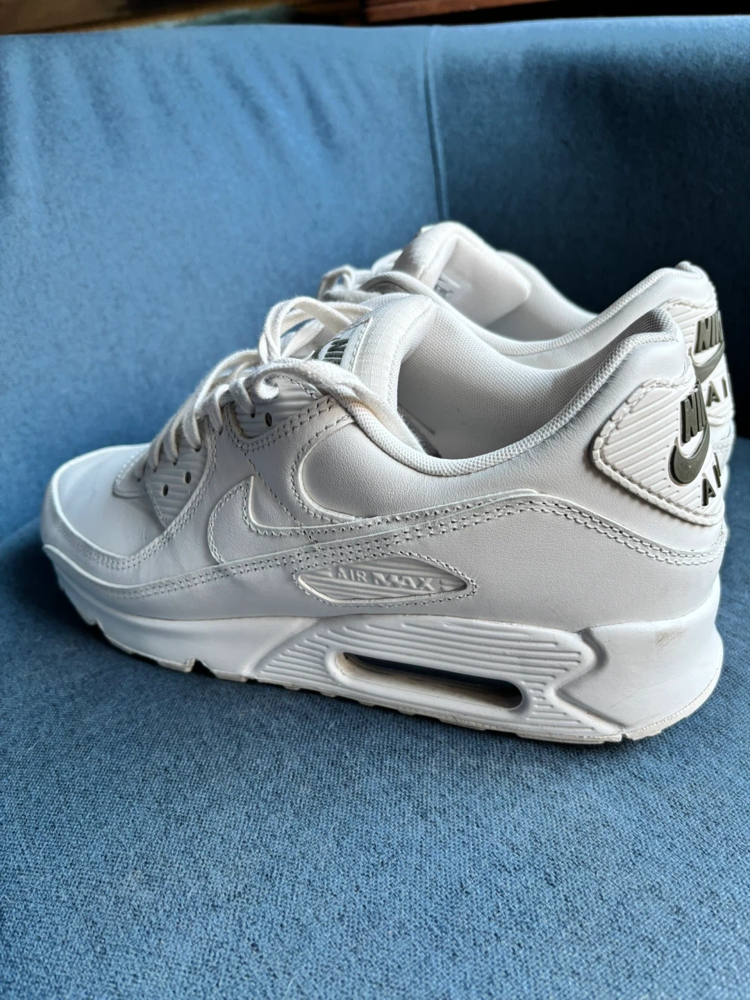 Selling a pair of Nike Air Max 90 sneakers in white. They're in good condition and ready for a new owner! The classic design is always in style.