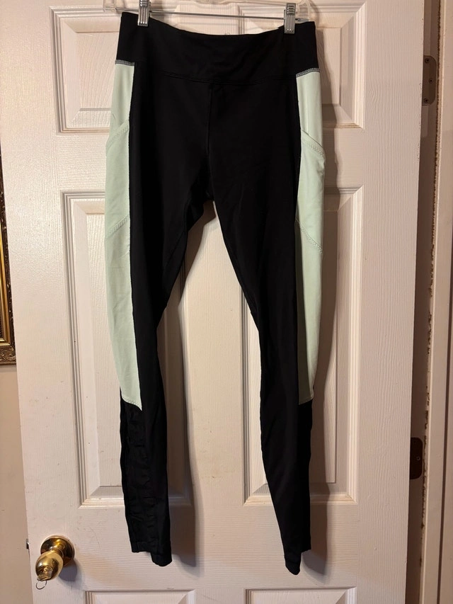 $35 or best offer - Authentic Lululemon leggings in size 10 with reflective logo on the calf. High-quality, supportive performance fabric with a sleek black and mint colour-block design. Comfortable, flattering fit — perfect for running, training, yoga, or everyday wear. Brand: Lululemon. Size: 10. Colour: Black with mint green panels. Reflective logo. Stretchy, supportive fabric. Excellent condition, no stains or damage.