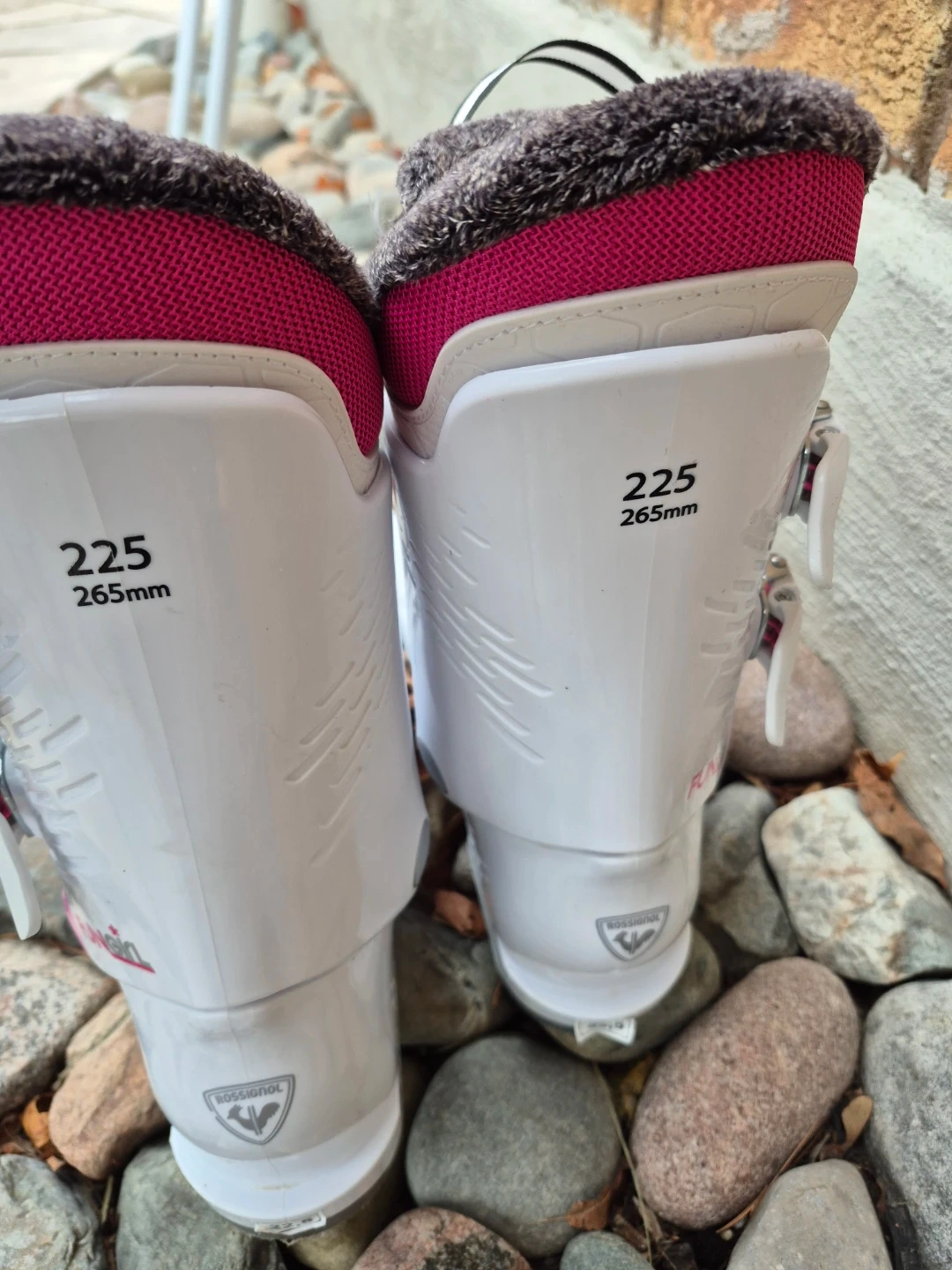 Selling a pair of quality nramd name Rossignol ski boots in white and pink! They are basically brand *NEW*. Fantastuc quaoity, comfirt and warmth. Made in Europe. They are size 225/265mm. These boots are ready for the slopes! Great find. Save $$$ and pick them up before they are gone.