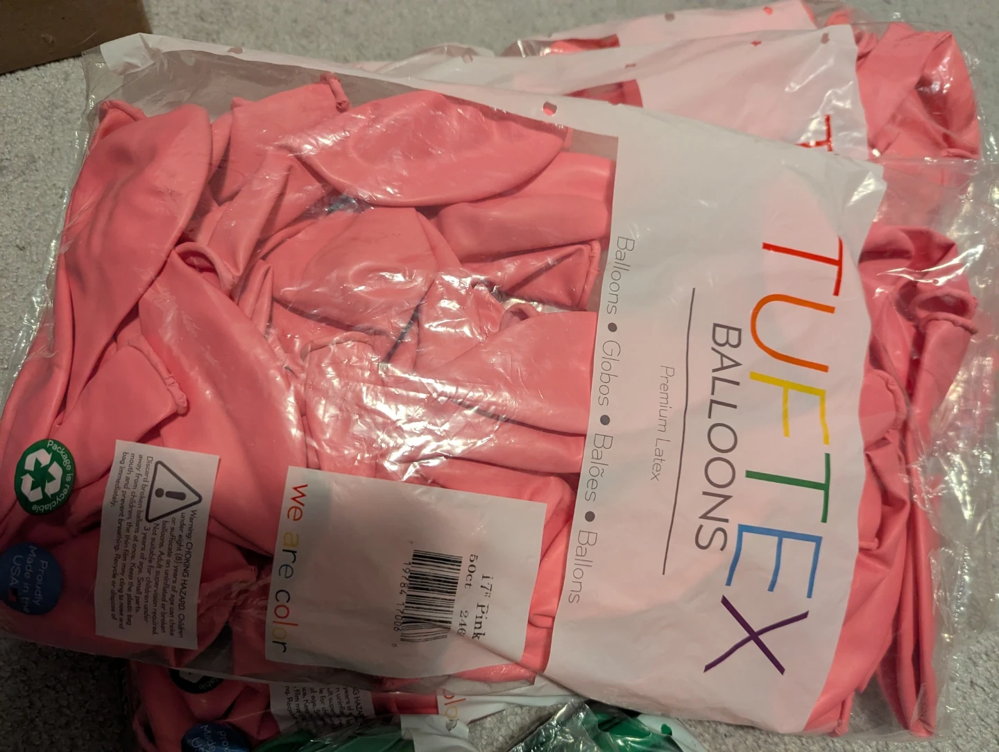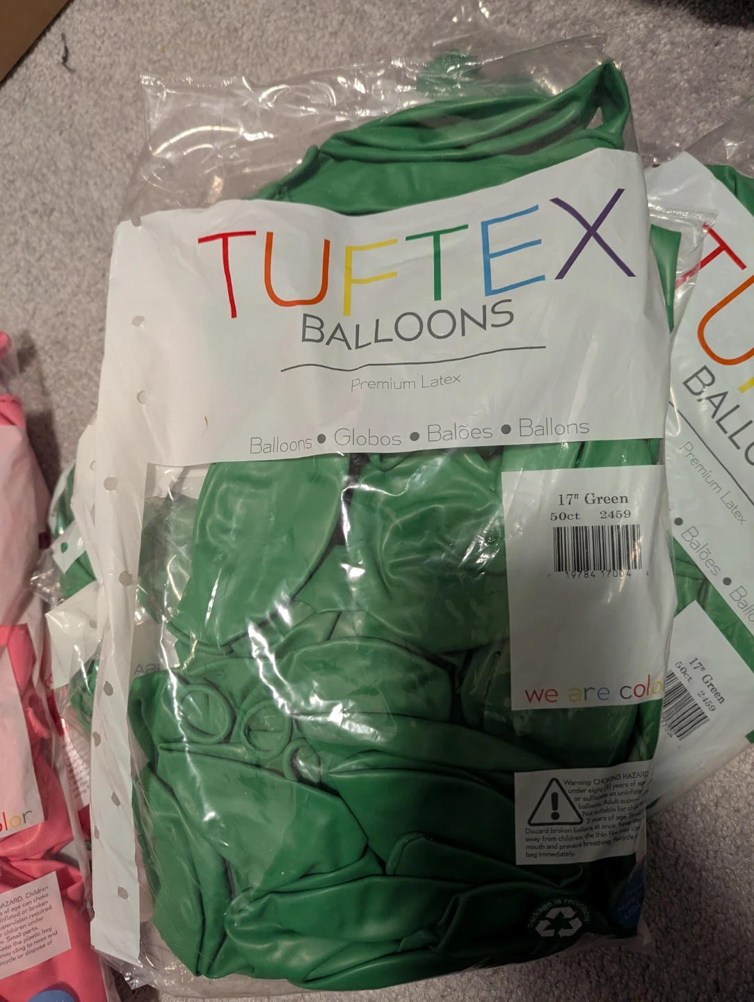 I'm selling a collection of Tuftex 17-inch balloons! Available in green, pink, black, and blue. Each package contains 50 balloons. Perfect for parties or events!