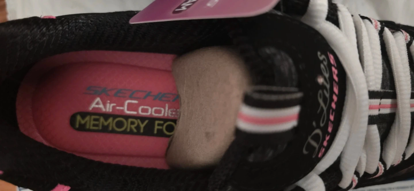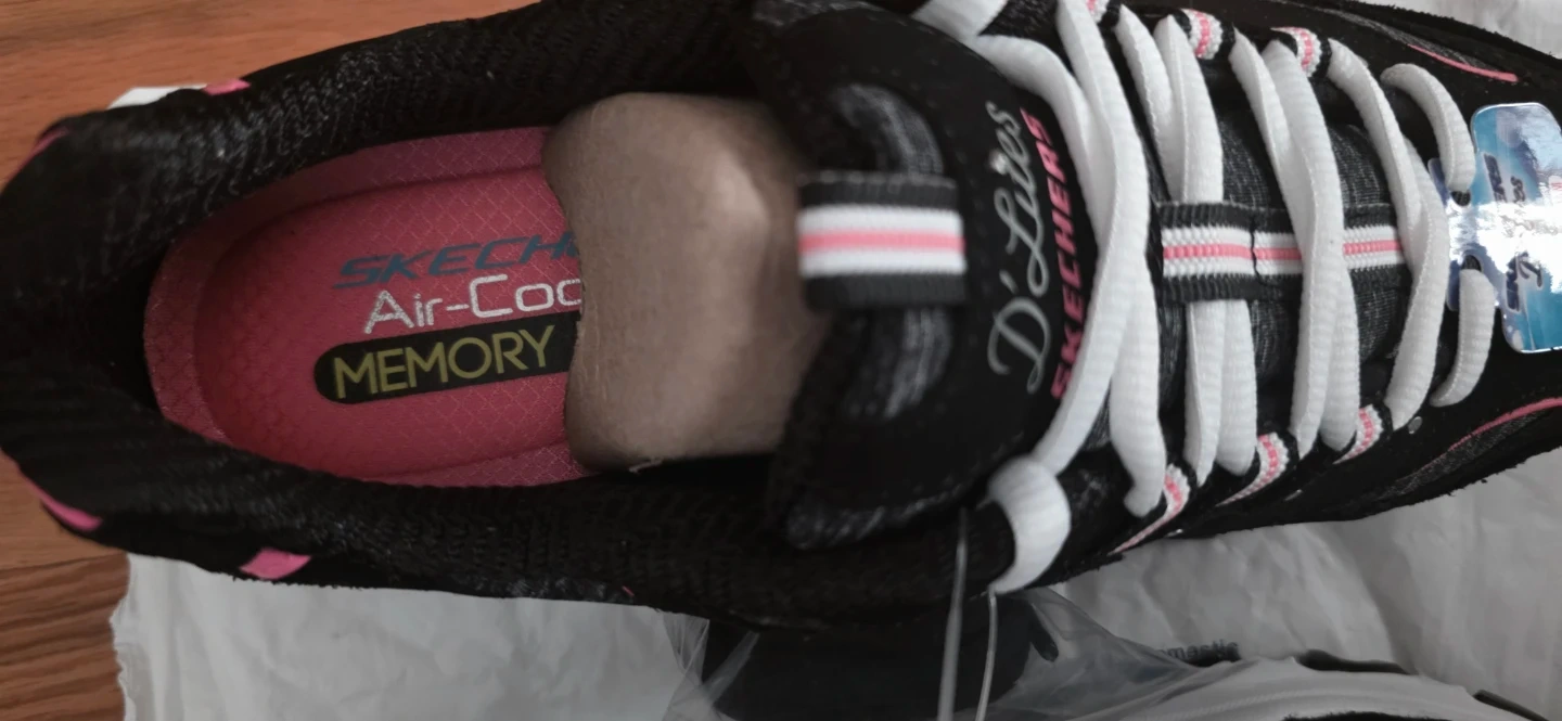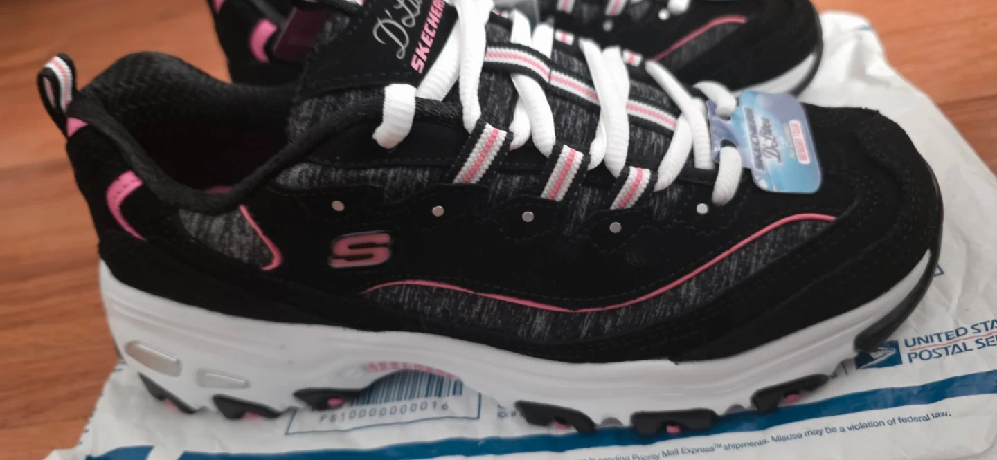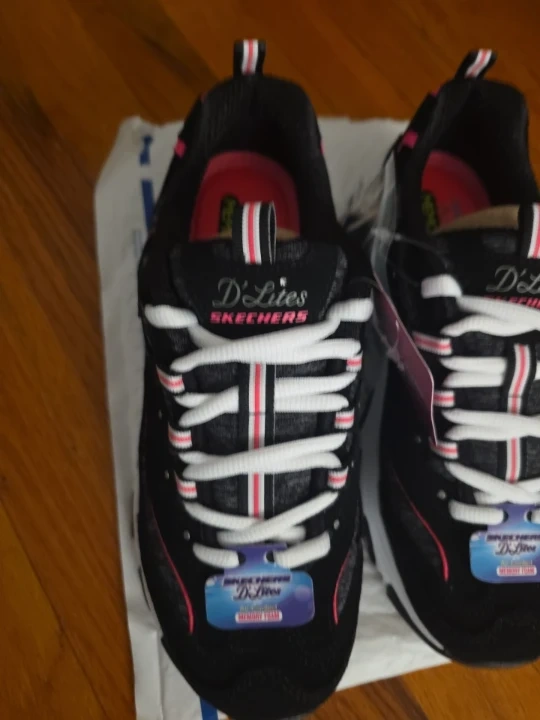 These are brand new Skechers D'Lites! They feature a black and pink color scheme and air-cooled memory foam for extra comfort. The design is stylish and sporty, perfect for everyday wear or workouts. Very comfortable! Size 7.5 no box these are new