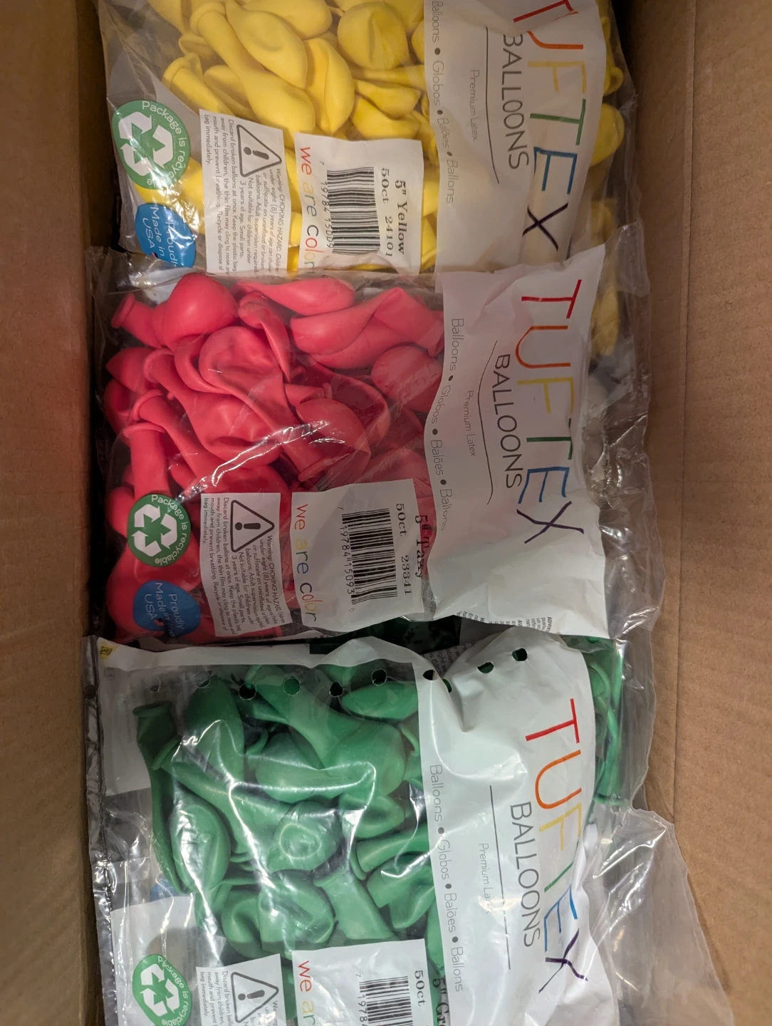 I have bags of TufTex 5" balloons available in yellow, red, and green. Each bag contains 50 balloons. Great for parties or events!