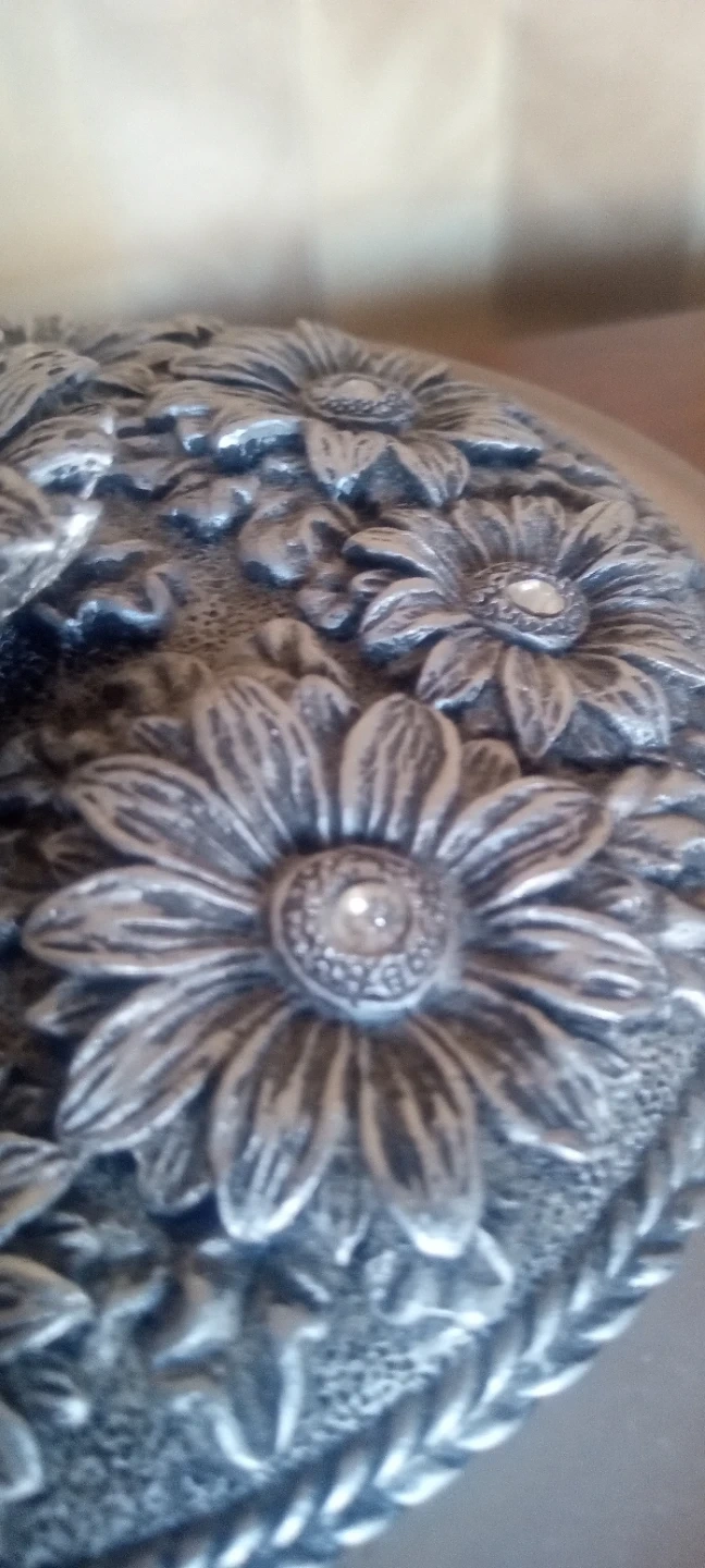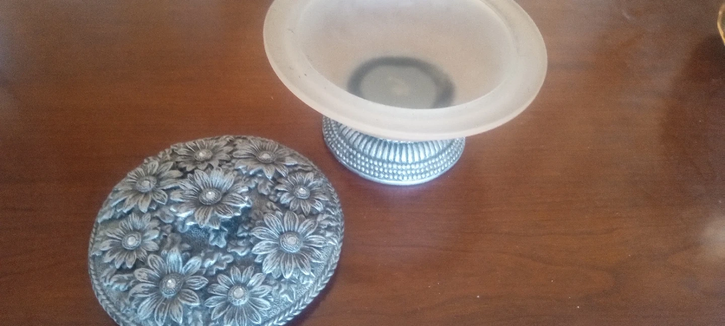 Selling a lovely trinket dish with a floral design on the lid. It has a frosted glass bowl and a decorative silver-coloured base and lid. Perfect for storing small items or as a decorative piece!