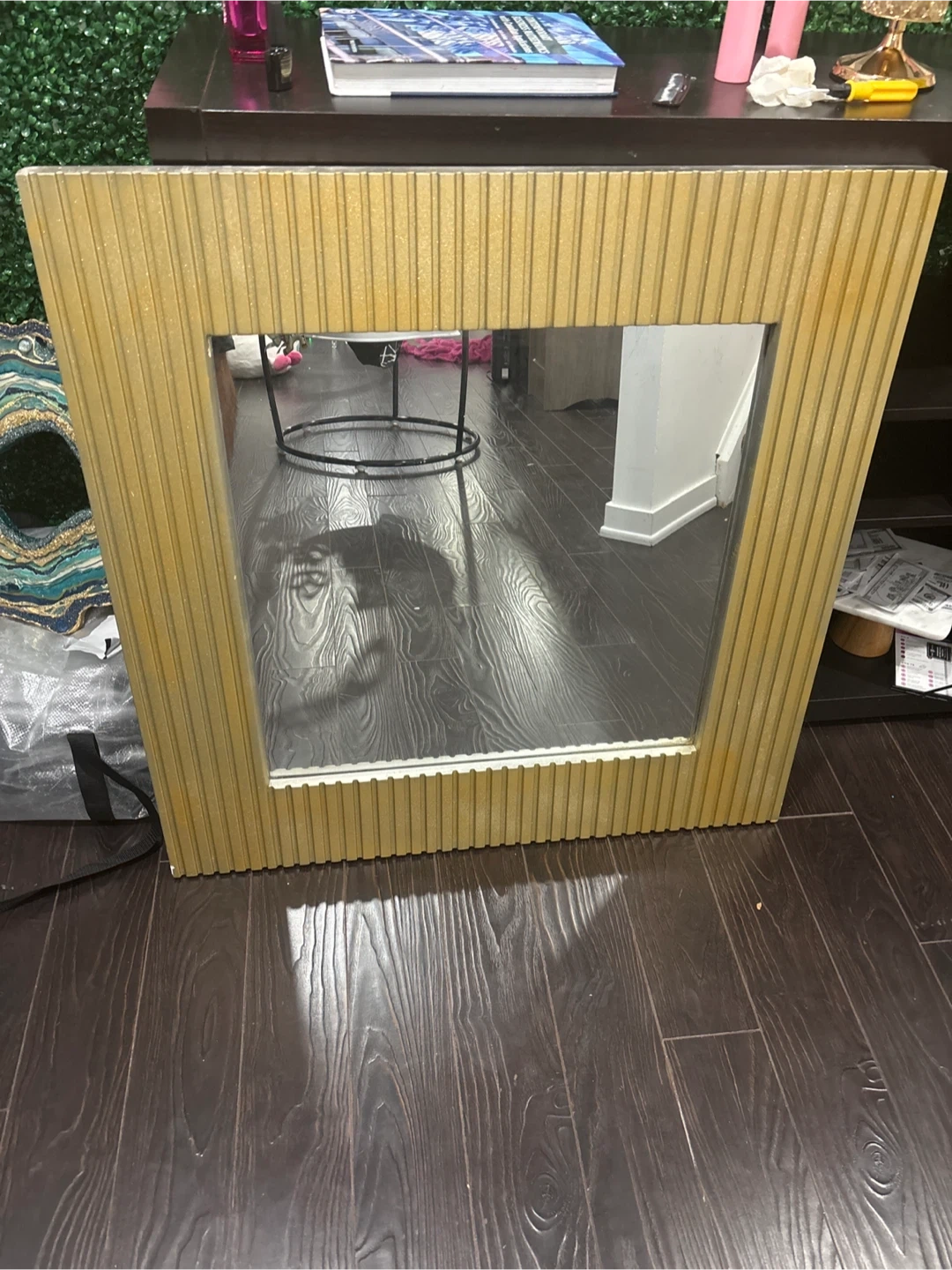 Used and in good condition. Square mirror with modern gold frame. No cracks, clean, ready to hang. Suitable for living room, bedroom, or entryway.