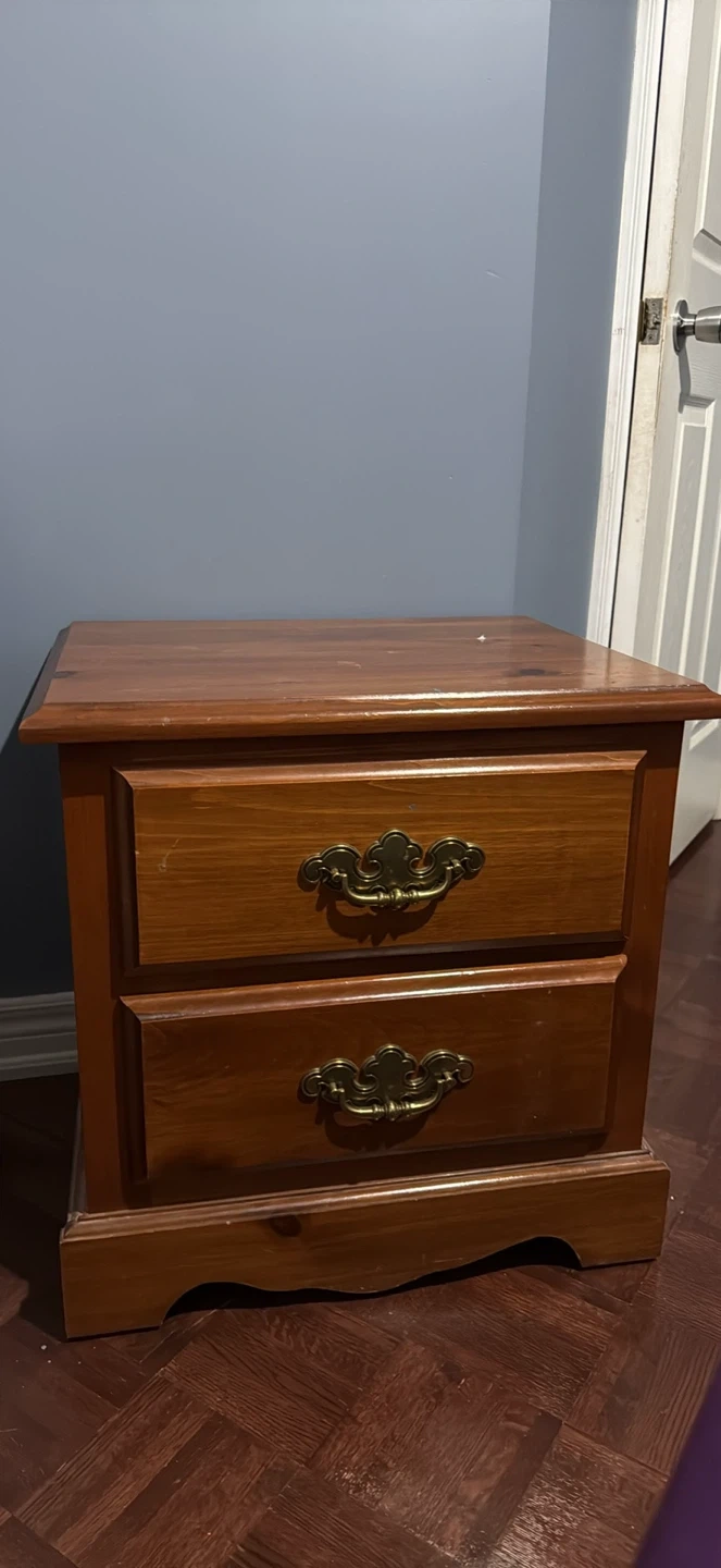 Here's a cute wood nightstand with two drawers! It has a classic look and would be great for a bedroom or guest room. It's in good condition and ready for a new home!