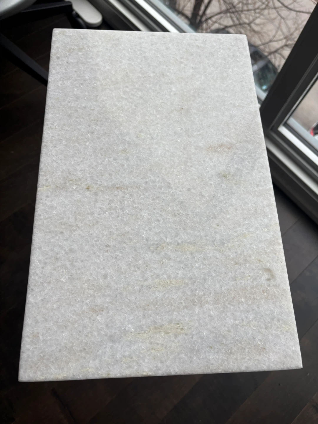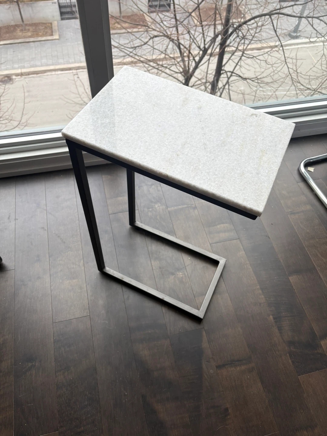C-shaped side table with a real marble top paired with a grey metal frame.