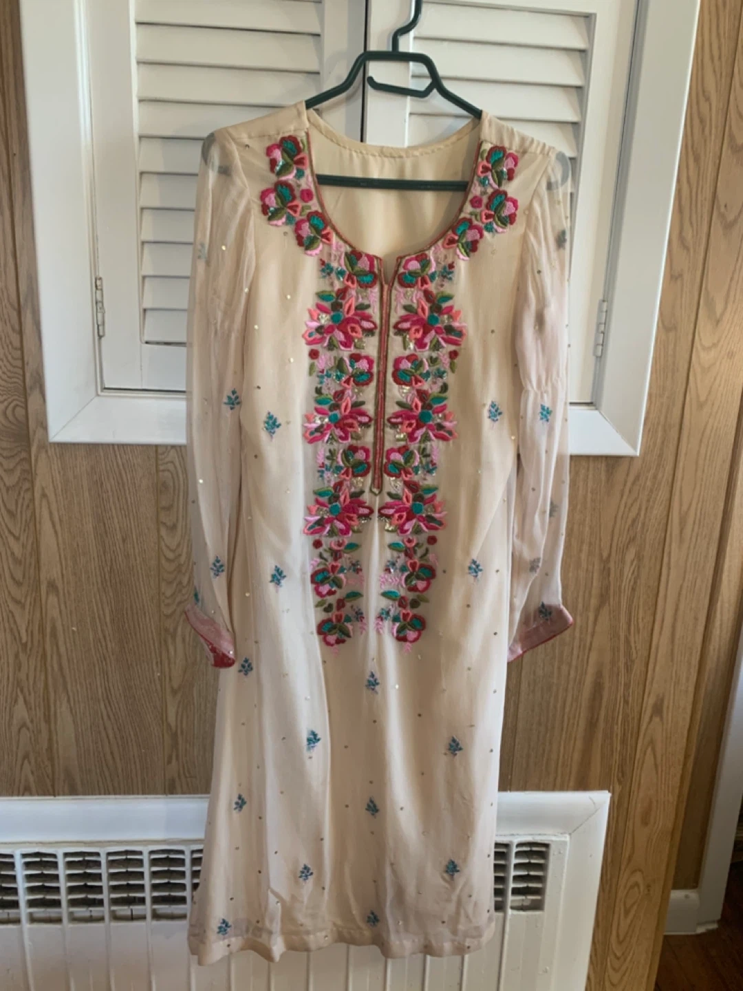 Selling a beautiful salwar kameez suit. It features intricate floral embroidery in pink, green, and blue. The fabric is a light beige color and has subtle sequin detailing. Comes with a red dupatta.