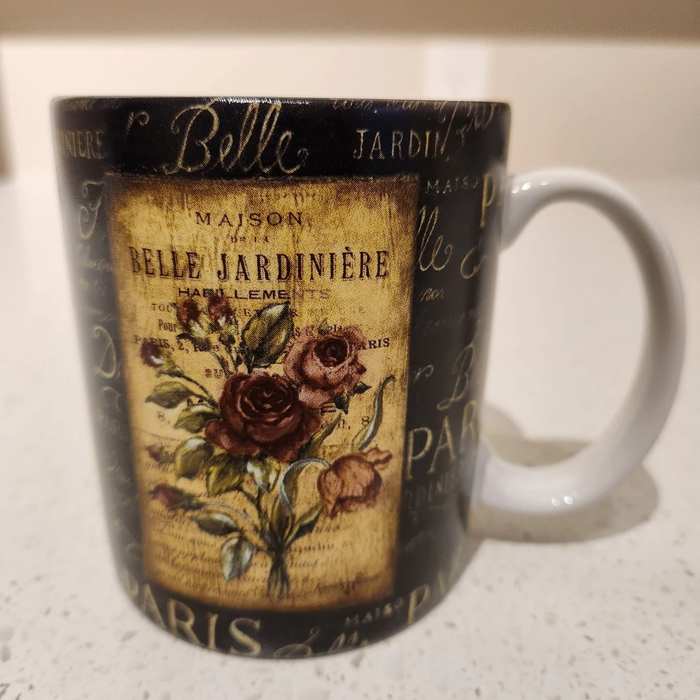 A beautiful Belle Jardiniere mug featuring a lovely floral design, perfect for adding a touch of elegance to your morning coffee or tea