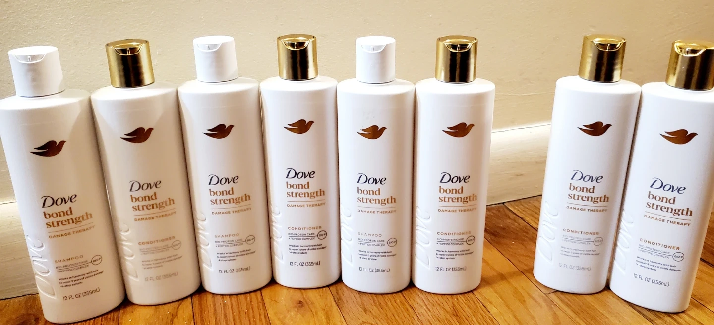 Dove Bond Strength Damage Therapy shampoo and conditioner. Each bottle contains 12 fl oz (355mL). The Bio-Protein Care + Peptide Complex works in harmony to repair 3 years of visible damage in a 4-step system
