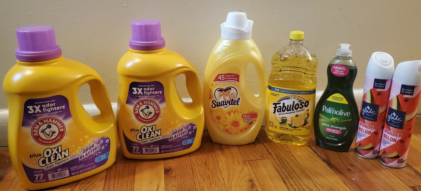 Bronx pickup. Morris ave area. Checkout other listings. $25 for all You'll get: - 2 Arm & Hammer Plus OxiClean Stain Fighters detergent (77 loads) - 1 Suavitel fabric conditioner (46 small loads) - 1 Fabuloso multi-purpose cleaner - 1 Palmolive Ultra Strength dish soap - 2 Glade Wonder Melon air freshener