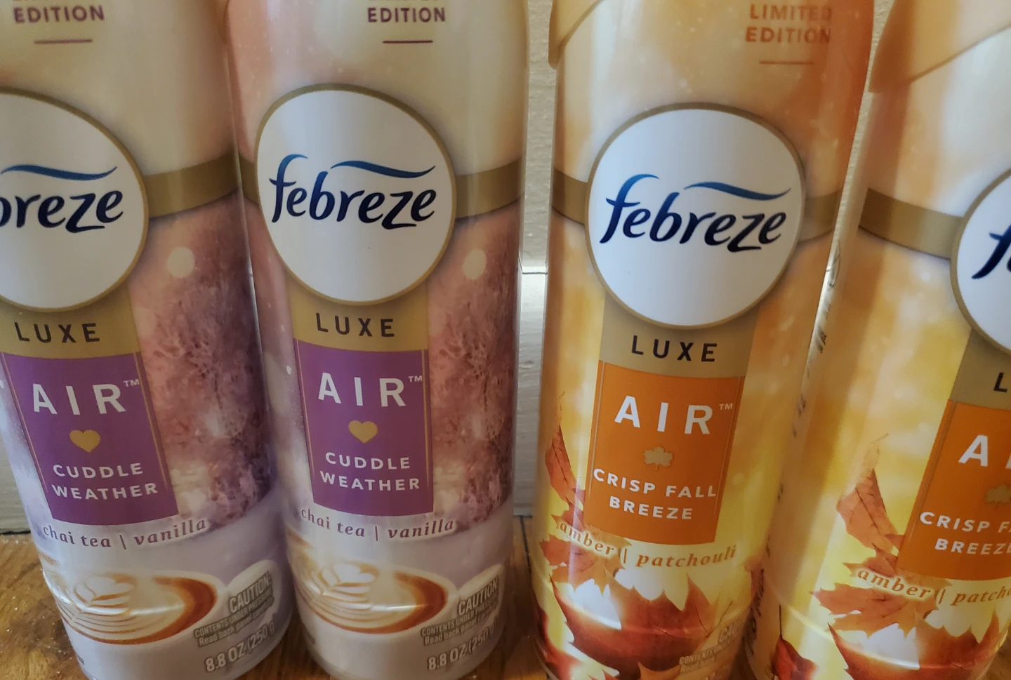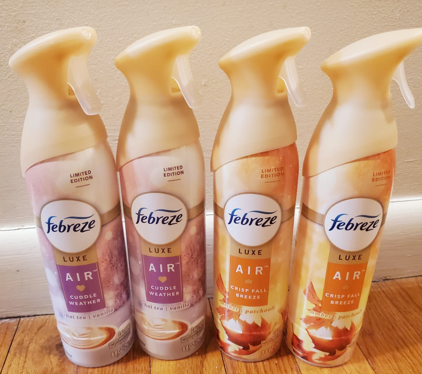 Selling a 4-pack of Febreze Luxe Air Limited Edition air fresheners. You'll get two Cuddle Weather (chai tea & vanilla) and two Crisp Fall Breeze (amber & patchouli) scents. Each can is 8.8 oz