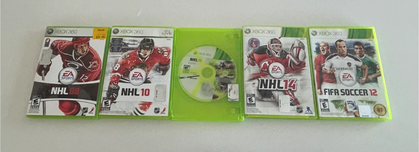 Selling a collection of Xbox 360 games! Includes NHL 08, NHL 10, NHL 14, FIFA Soccer 12, and NHL 11 (disc only). Great for some retro gaming fun!