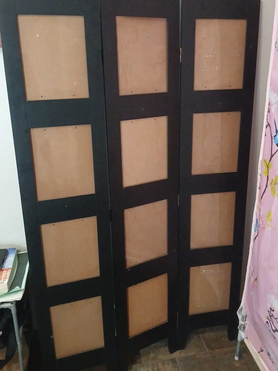 This is a black folding room divider. It features several photo frames so you can personalize it with your favourite pictures. It's in great shape and ready to add some style to your space!