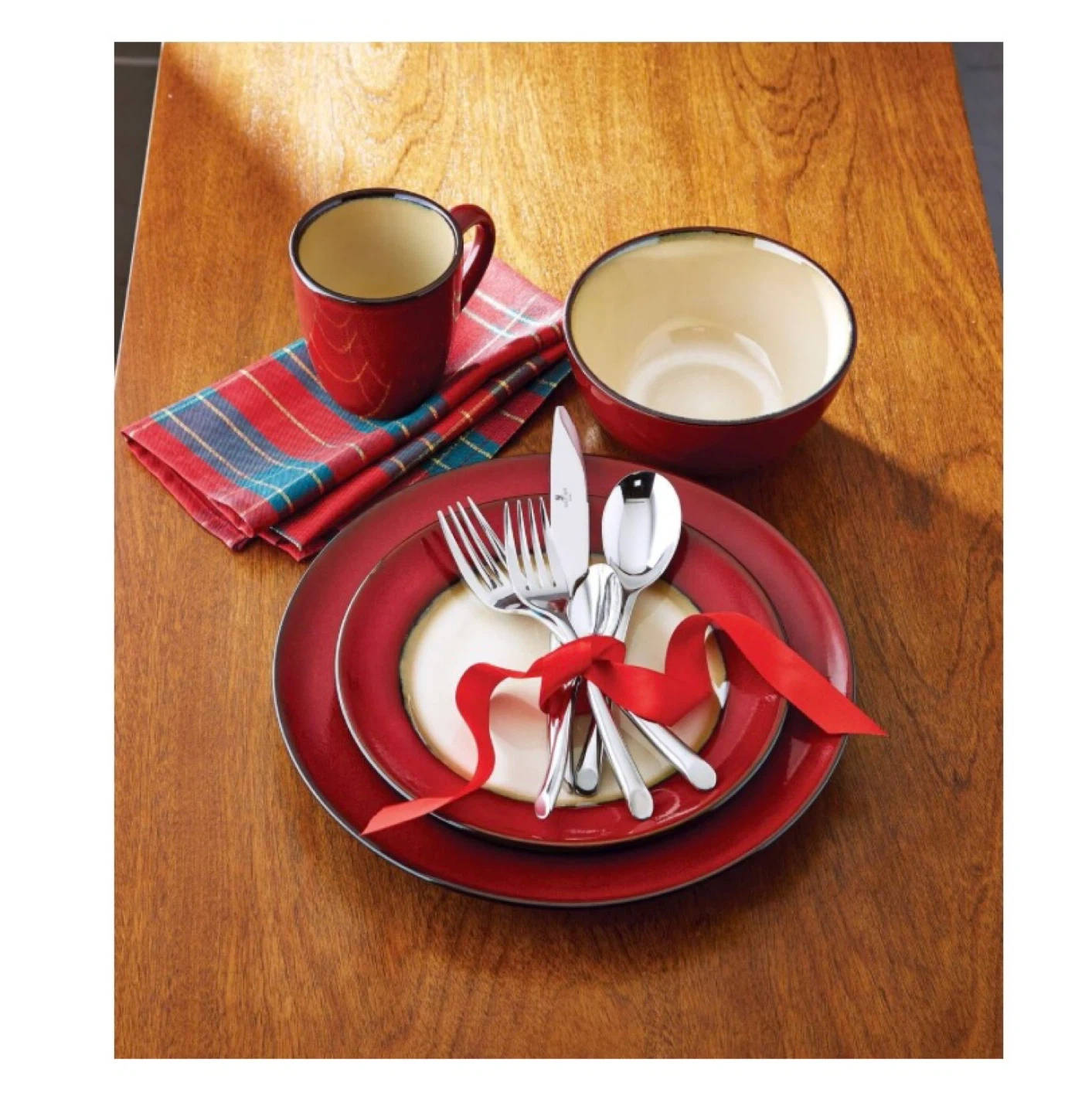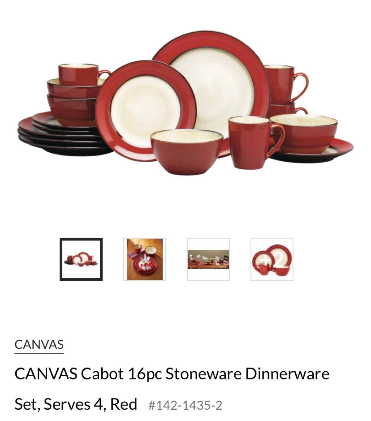 Selling a CANVAS Cabot 16-piece stoneware dinnerware set in red. This set serves 4 people and includes dinner plates, salad plates, bowls, and mugs. Perfect for everyday meals or special occasions! Still in the box, unopened!!